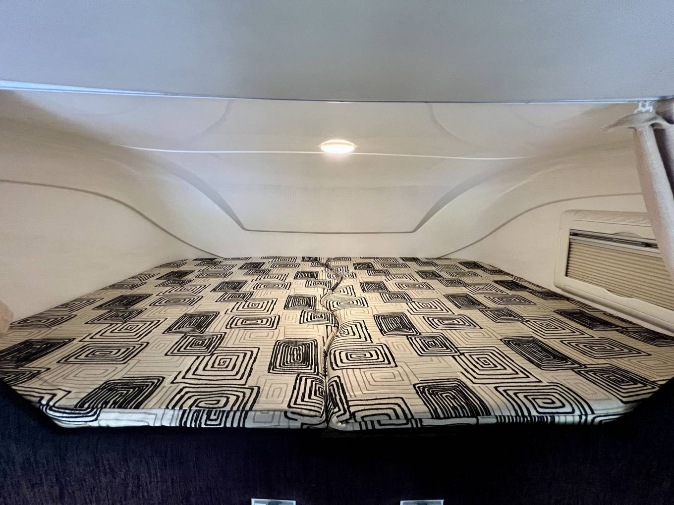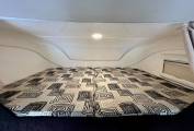 Accommodation is surprisingly good, with a full dinette including two tables, 6 seatbelts in total, an overcab bed and rear kitchen and washroom. Pretty amazing on such a small footprint, when you consider there is a range of storage too, including pelmet lockers and pull out wardrobe. There is even a drop down multifunction TV.