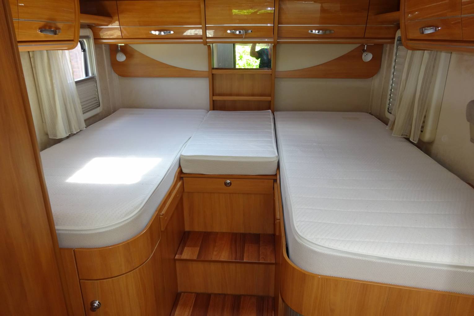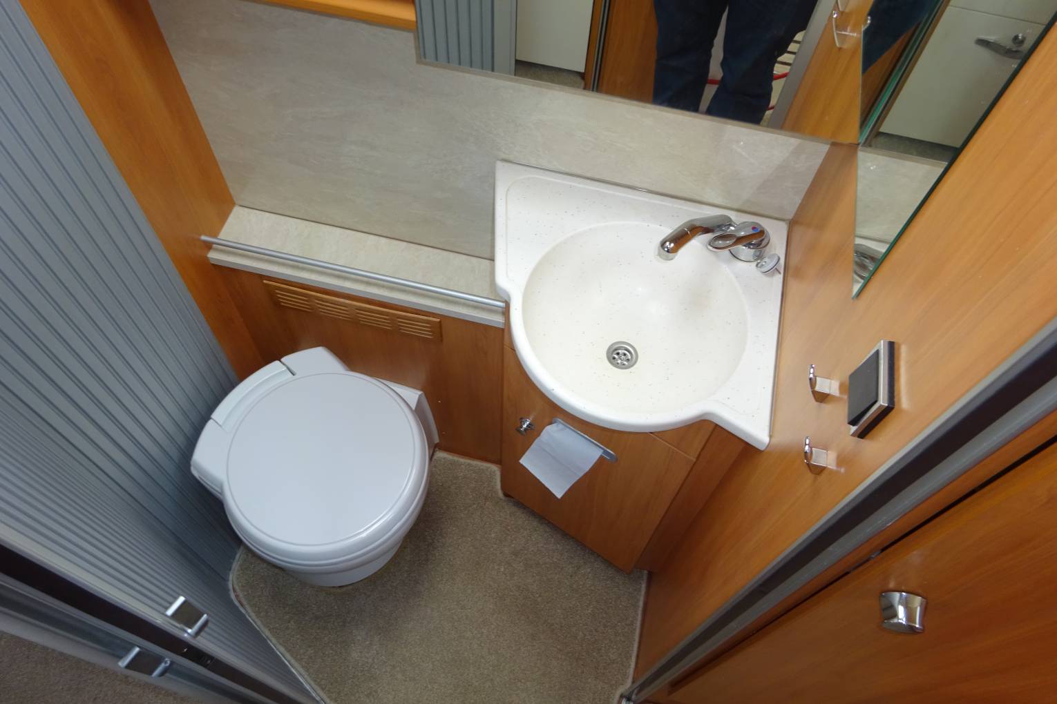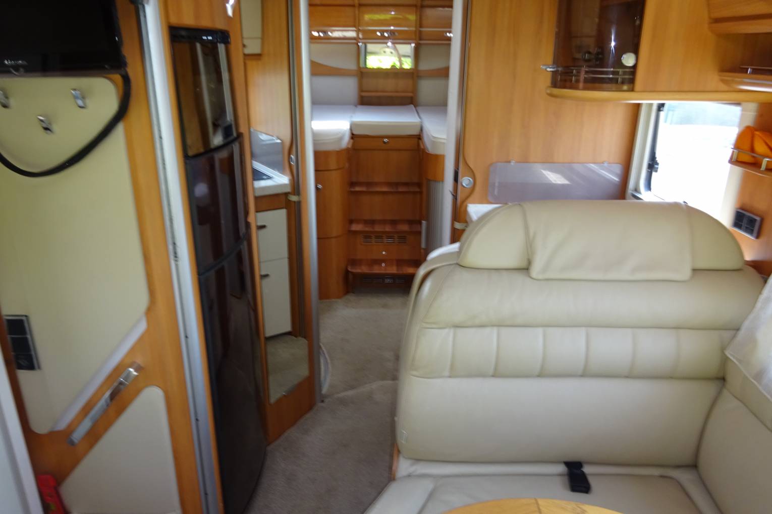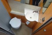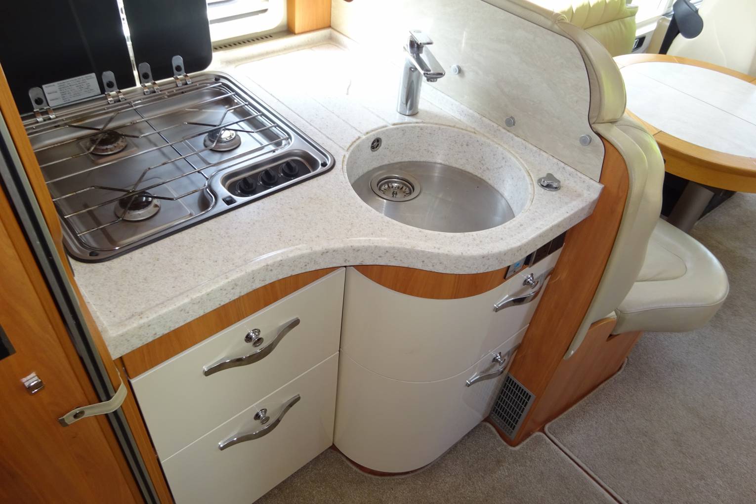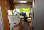 There is comfortable sleeping for up to 4 adults, separated by privacy doors. The contemporary split washroom area has a full size shower cubicle on one side, and the toilet and washbasin, mirror, medicine cabinet and vanity unit on the other. At the rear of the motorhome there are single beds that can be made in to a large double with plenty of storage including a wardrobe and over head cabinets. This is complemented with a large drop down bed at the front of the motorhome. It easily sleeps 4 without having to continually be making up beds. It has the added benefit of the preferred Alde heating system and also has a habitation air conditioning unit. It is also fitted with a satellite tv system.