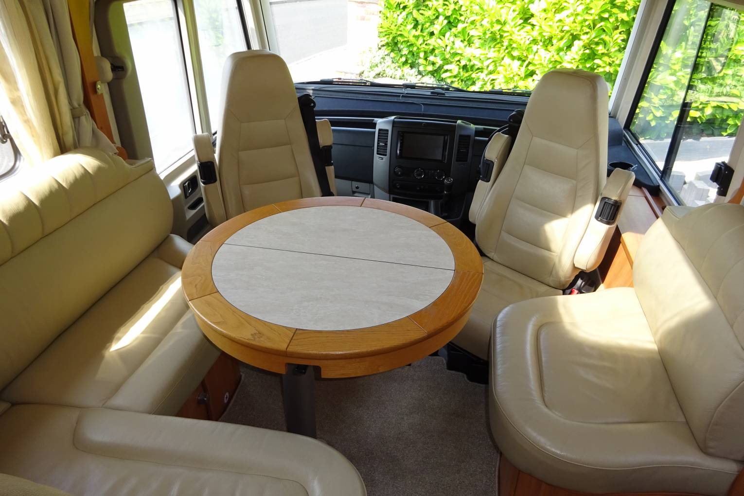 As you enter the motorhome you get a real feeling for the luxury and High quality build that this motorhome has. At the front of the van there is a large seating area finished in full cream leather and with the 2 captains chairs it easily seats 6. The modern kitchen area comprises a three ring gas hob, separate oven and grill, high quality food preparation worktops and sink, mixer tap, and fridge with separate freezer compartment. There is plenty of storage and cupboard space throughout.
