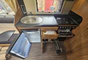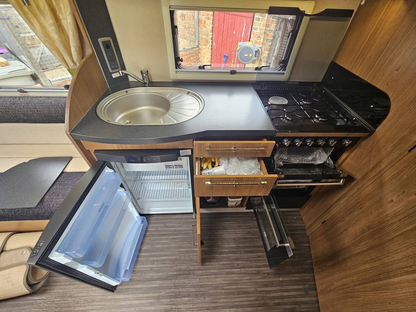 The body subtype is coach built, and it runs on diesel fuel. Features include cab air conditioning, a centre dinette, a washroom, and a kitchen equipped with a 3-burner gas hob, 1 electric hob, oven, grill, and fridge/freezer.