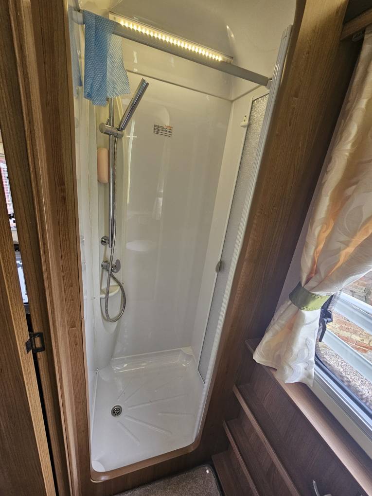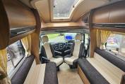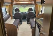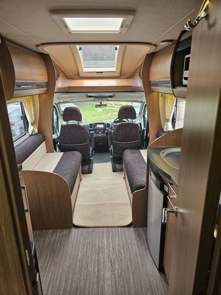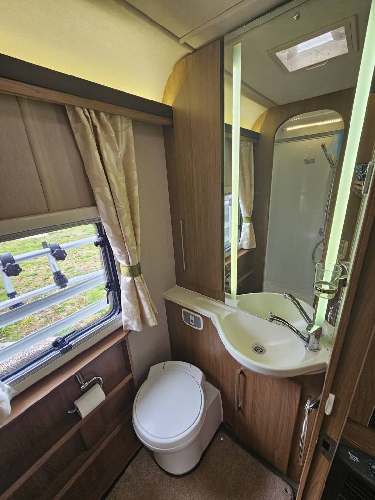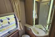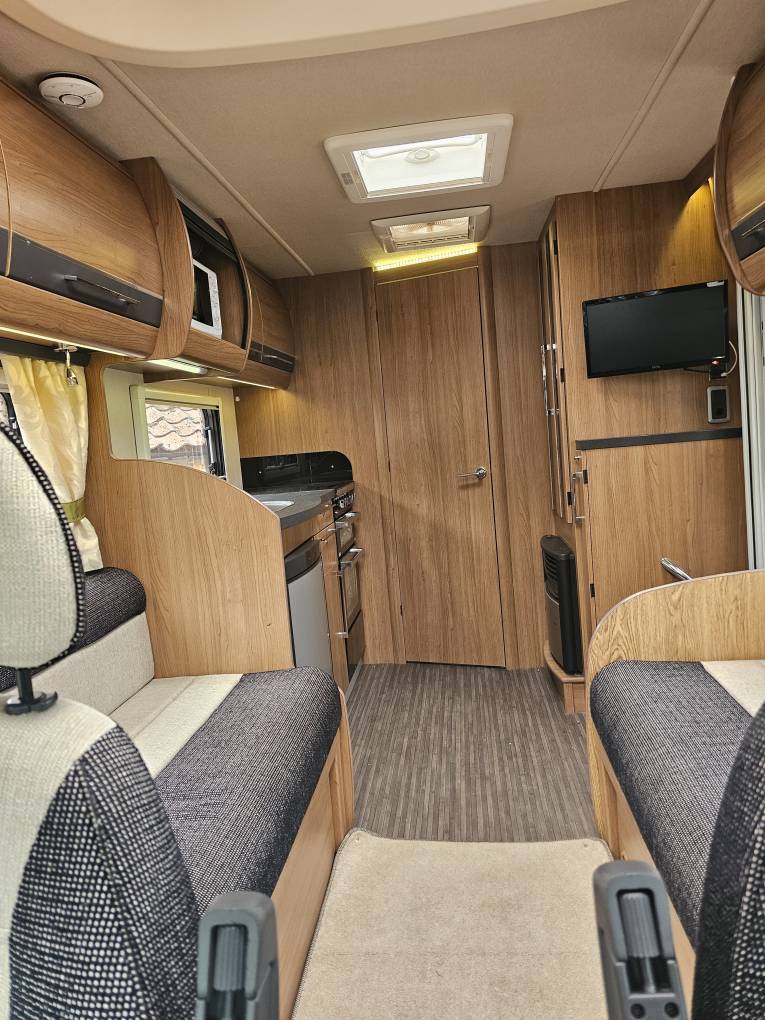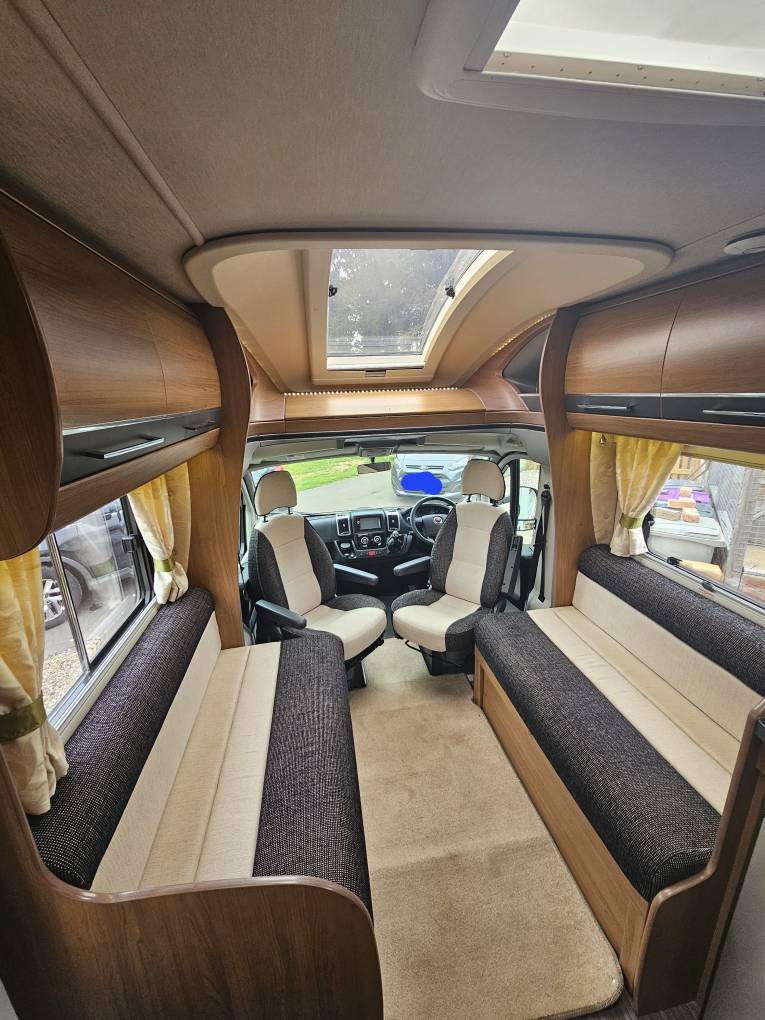Inside, the motorhome offers a spacious, well-lit living area with large windows and comfortable side benches that convert into 2 singles or 1 double bed, with under-bench storage. It includes ample overhead cupboard storage, a stylish bathroom with a separate shower, toilet, and sink, and a Truma heating and hot water system for year-round comfort. LED lighting is present throughout, and entertainment features include a TV. The motorhome is also equipped with front and side window blinds, habitation blinds and fly screens, and a sat nav system along with a DAB radio with Bluetooth.
