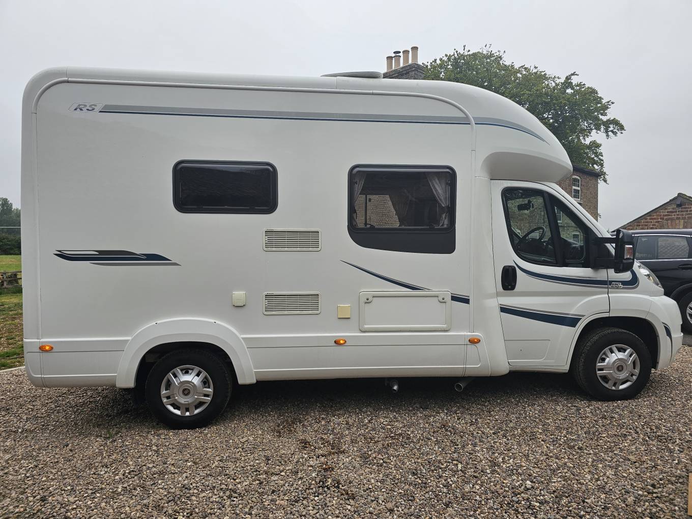 Maintenance has been kept up to date, with the cambelt changed in 2023 at 24,000 miles. The exterior features a sleek, aerodynamic design with high-quality, durable bodywork, alloy wheels, external storage compartments, a large awning for outdoor living space, and an electric step. There is also a spare wheel included.