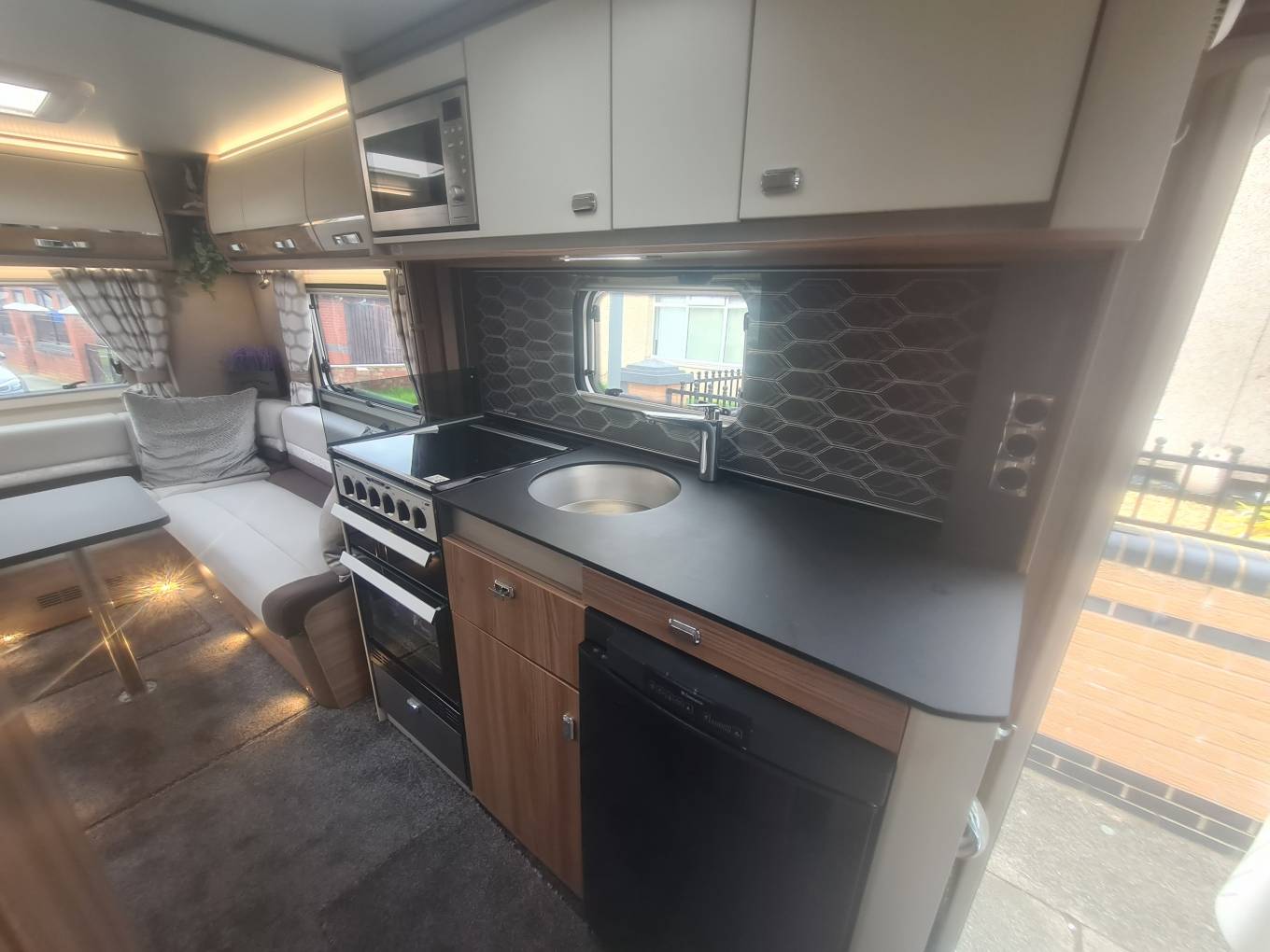 As you enter the Motorhome you'll find a well equipped kitchen area that has an oven/grill, Duel fuel cooker with electric hot plate and 3 ring gas hob, fridge/freezer, built in microwave, sink with mixer tap and a large worktop for food preparation. Also mid-ship we have the washroom with toilet, large shower cabinet a sink with mixer tap and a good size wall cabinet.
