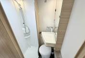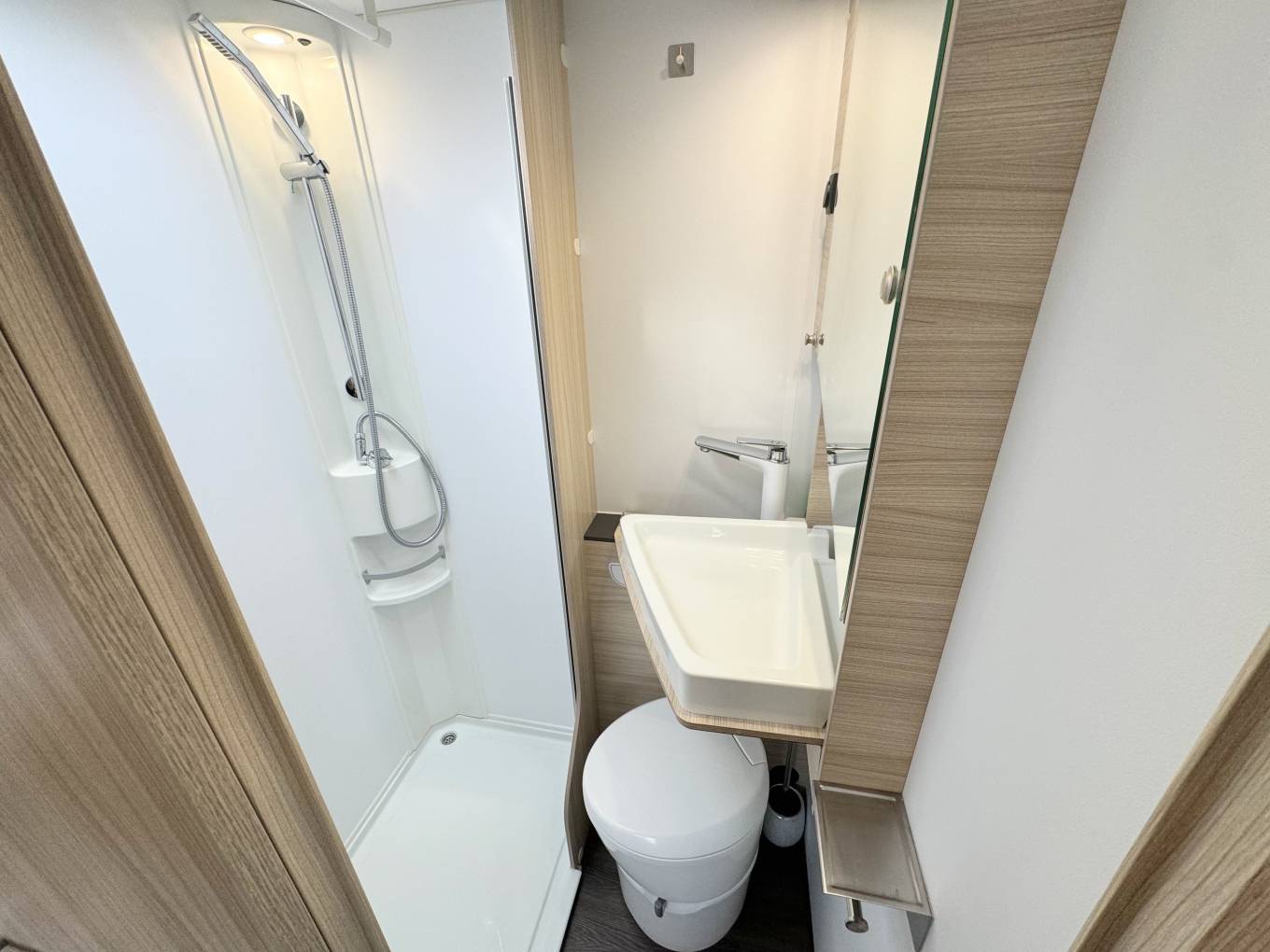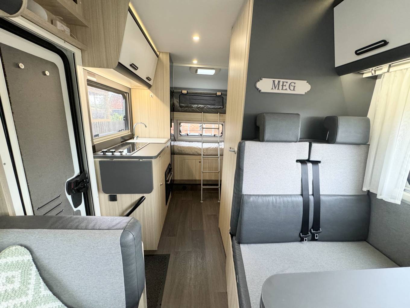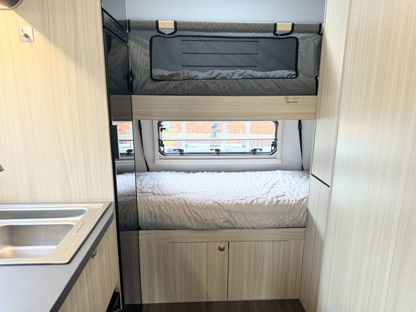 The washroom features a generous separate shower, a foldaway mirrored sink, a toilet cassette, and plenty of storage for your toiletries. The bedroom offers fixed bunk beds, with the option to remove the bottom bunk for a larger storage space or garage area.
