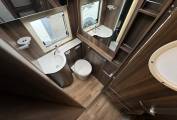In the center is a bathroom with seperate shower, sink and swivel toilet. opposite is a kitchen area with large fridge freezer and oven/grill.