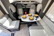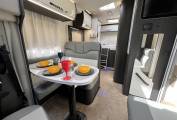 A pedestal mounted dining table slides in all directions and from above an electrically powered double bed glides down which measures 6ft 2in x 3ft 10in.