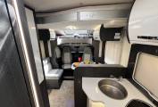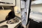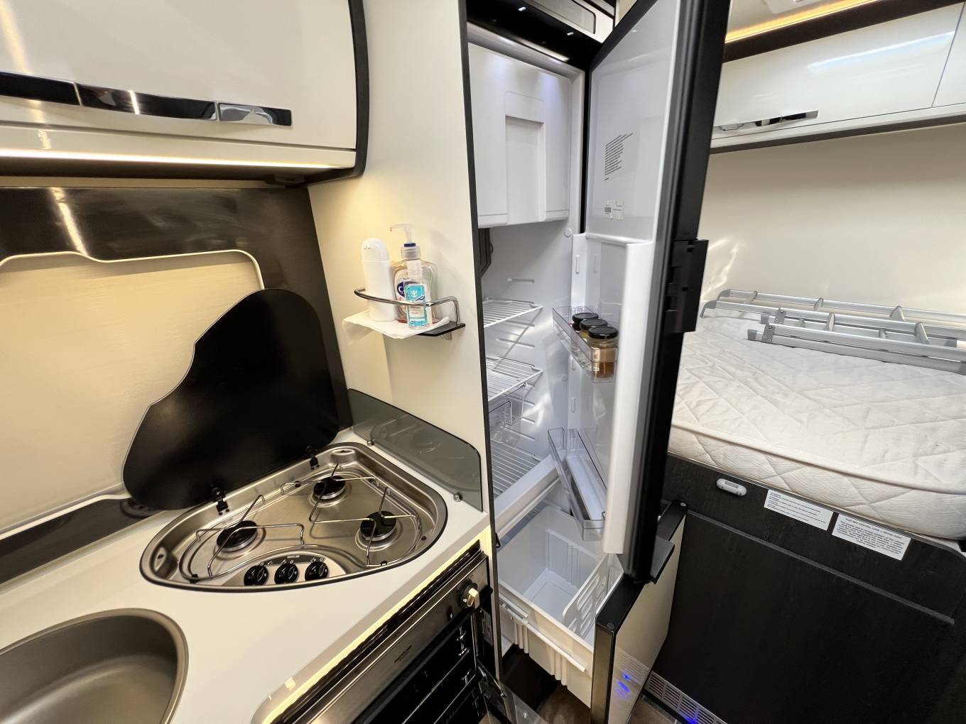 Across the centre of the motorhome is the kitchen consisting of a Three Burner Gas Hob, an Oven/Grill, a Thetford Fridge Freezer, a Sink with a Hot & Cold Mixer Tap, plus plenty of cupboard space.