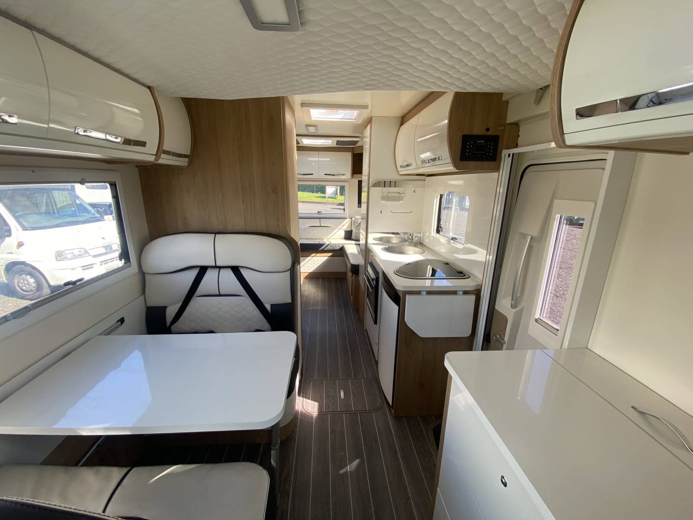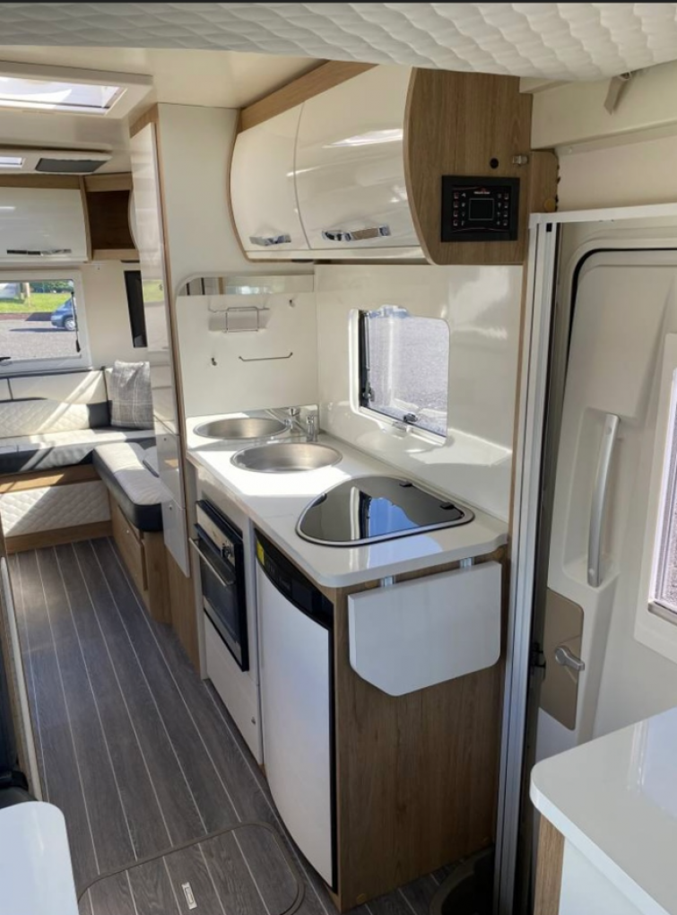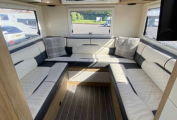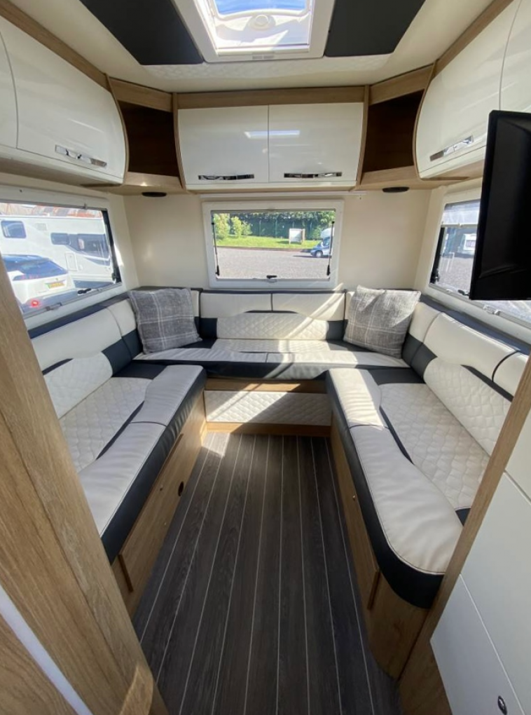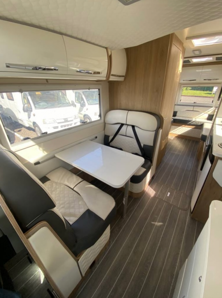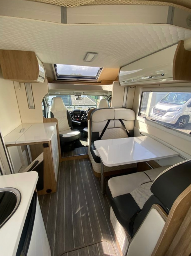 The front cab area has two designated travelling seats that will both swivel in a captain style for dining and relaxing and has cab air conditioning, concertina black-out surround cab blinds, Xzent multimedia system and the motorhome comes with a Fiamma awning, solar panel, 2 Smart TV’s, Maxview TV aerial, bike rack and external BBQ point.