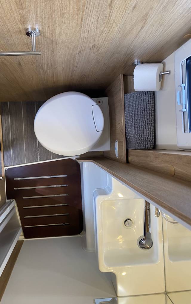 Side washroom with a cassette toilet, vanity sink shower cubicle. Side