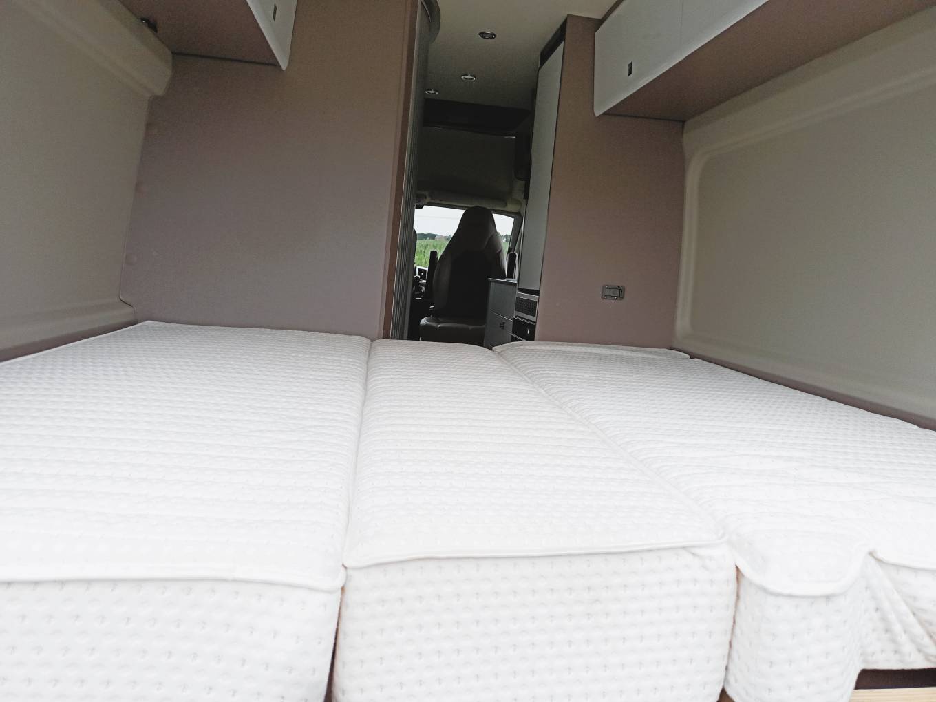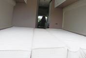 Rear bed with central lift out section can be configured as two singles, or a very large double. With the central section removed and set to one side, large items can be carried, for example cycles.