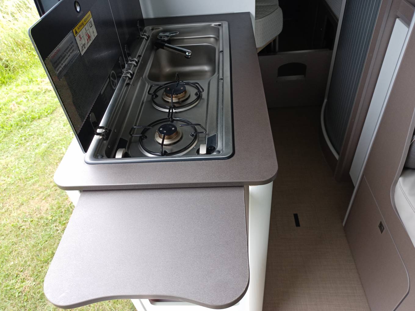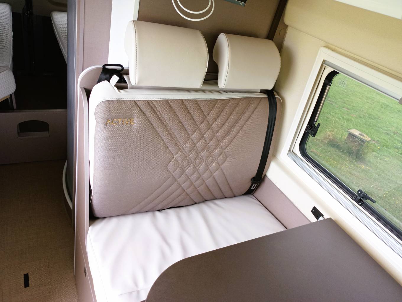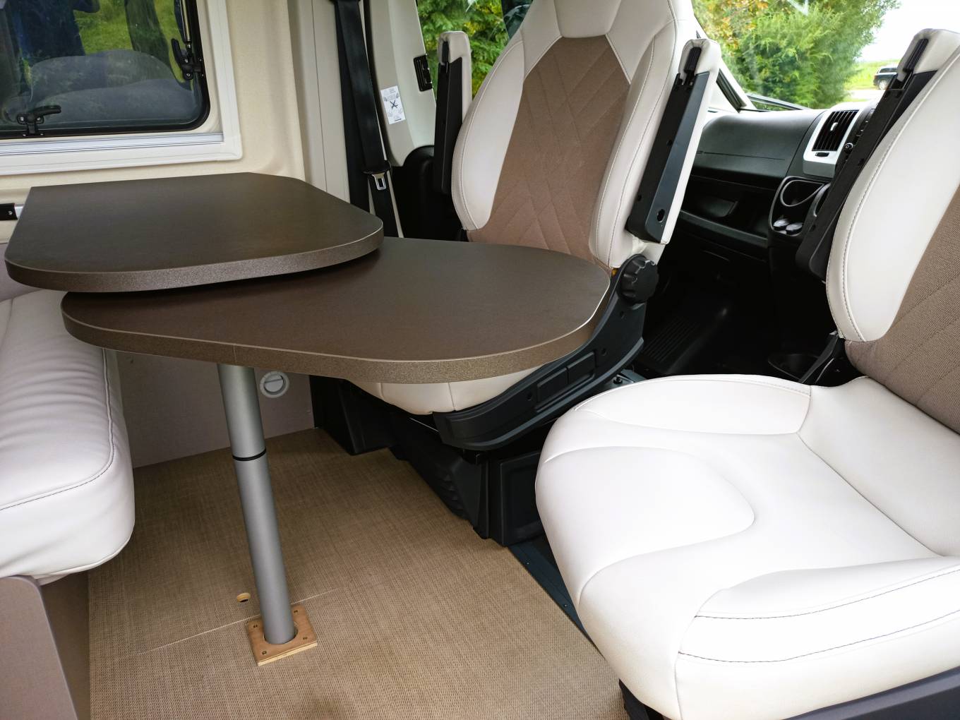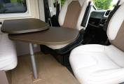 Four can sit and eat in comfort with swivelling cab seats a dinette style twin seat and a swivel out table leaf.