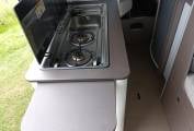 An easily raised pop top offers two additional, spacious berths with a memory foam mattress, zip out sections to the sides and ventilation sections with mesh insect nets.