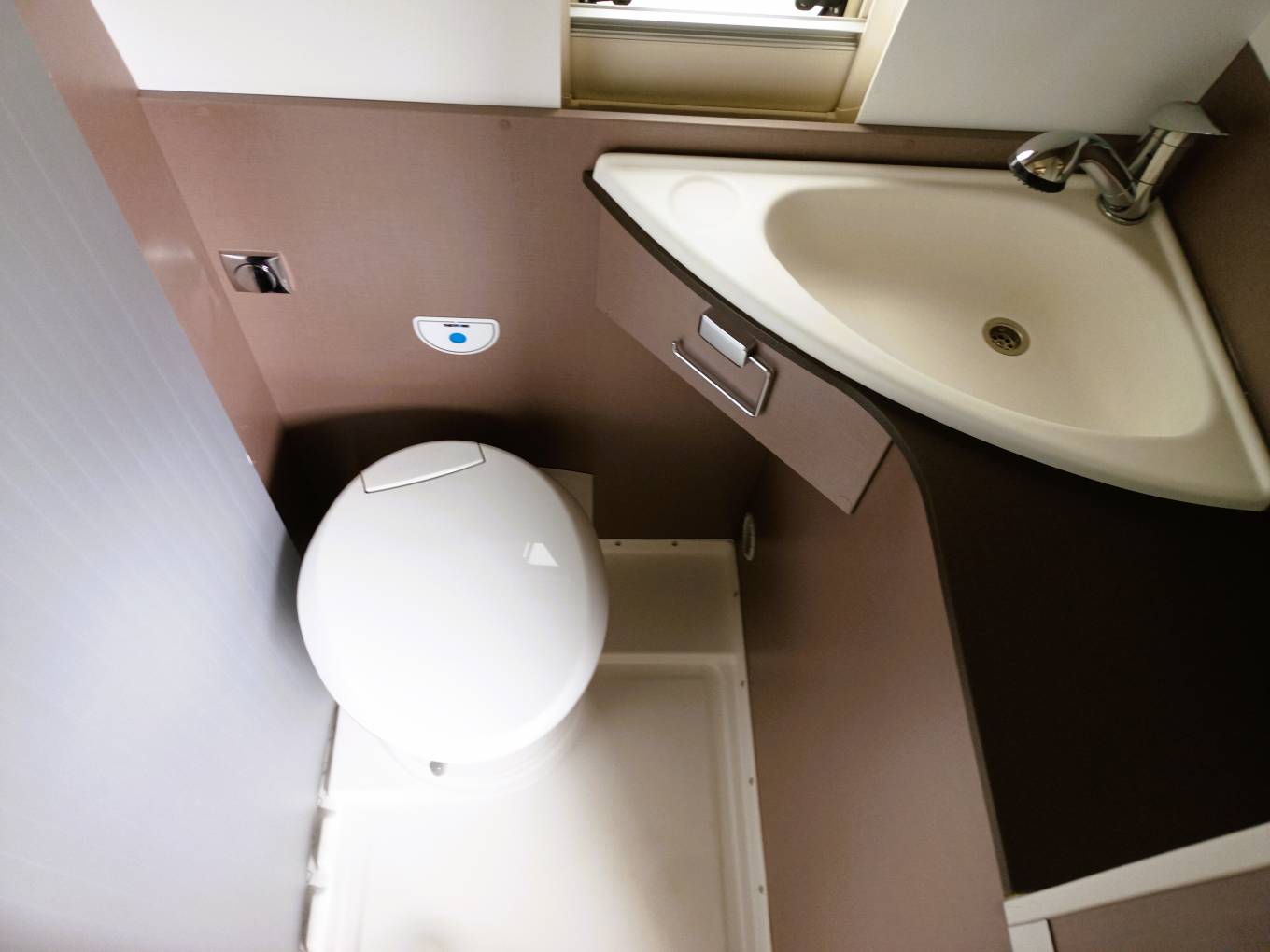 The shower room offers a sink, pedestal loo, and a slide out shower head from the sink. The door is finished in a proofed material so you won't have to wrestle with a shower curtain.