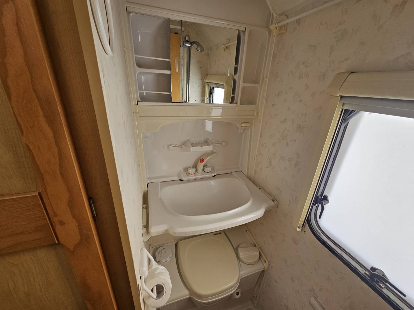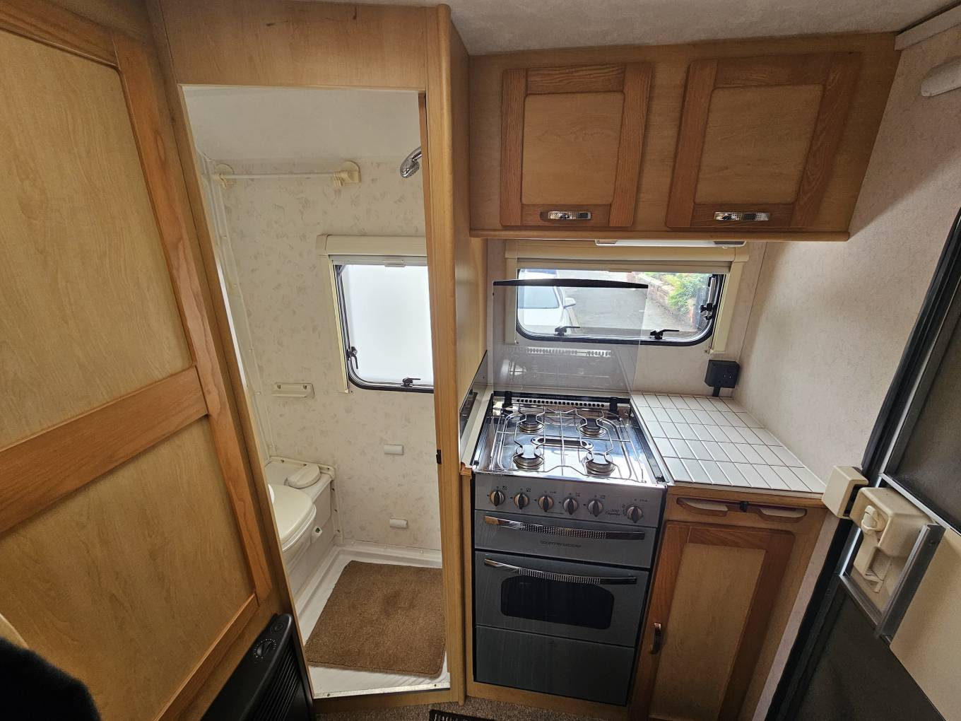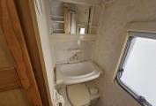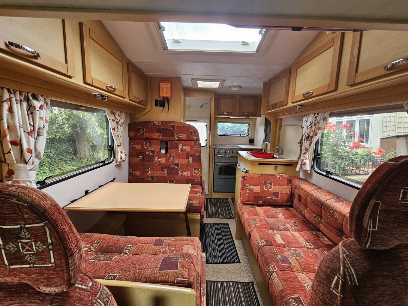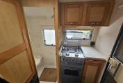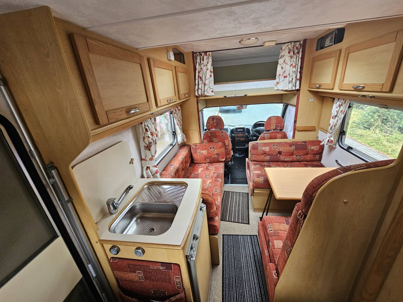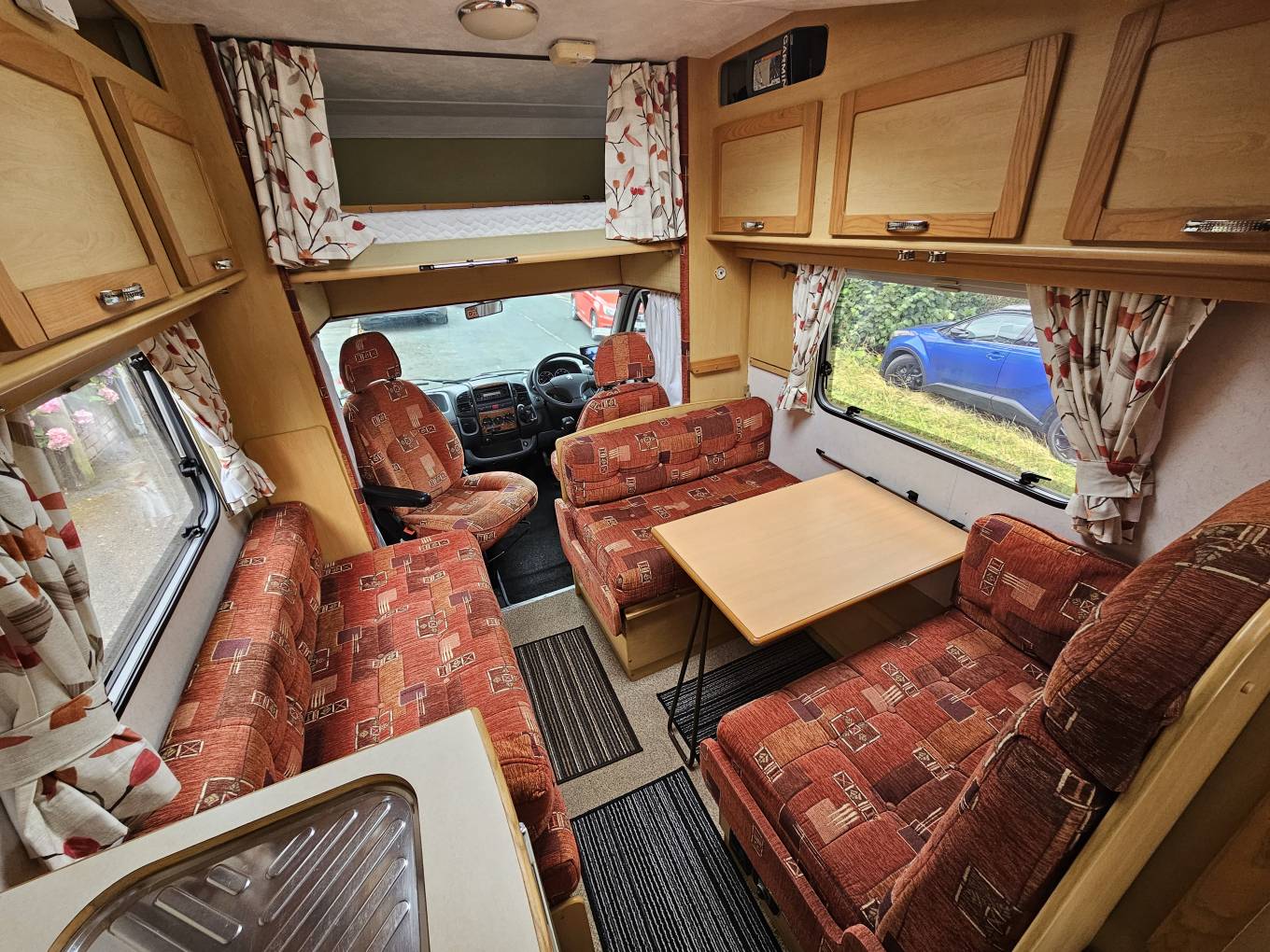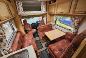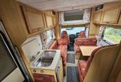 The kitchen is well-equipped with a 3-burner gas hob, grill, oven, sink, and a 3-way fridge, located at the rear end of the motorhome. The bathroom features a cassette toilet, shower, and washbasin. The living area provides comfortable seating, a fold-away dining table, a wardrobe, and a heater, with a central dinette setup for added convenience.