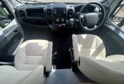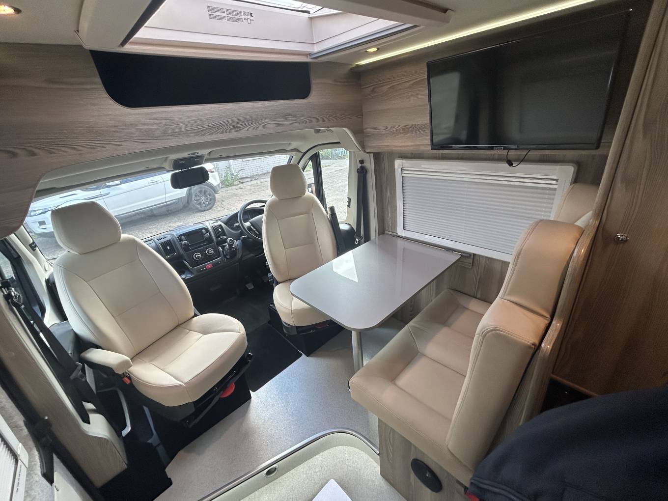 The cab is designed for ultimate comfort and convenience, offering sat nav, cruise control, built-in blinds, two captain seats, Bluetooth connection, and a high-quality Pioneer sound system that extends throughout the motorhome.