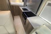 The kitchen features a full oven and grill, gas hob, sink with mixer tap, abundant storage, a 240v/12v fridge freezer, 240V and 12V points, plenty of workspace, and a large splash back for easy cleanup.