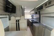 Step into the inviting dining area, complete with a removable table, two forward-facing seats, and two rear seat belts. The space is enhanced with mood lighting and includes ample storage, and a TV.