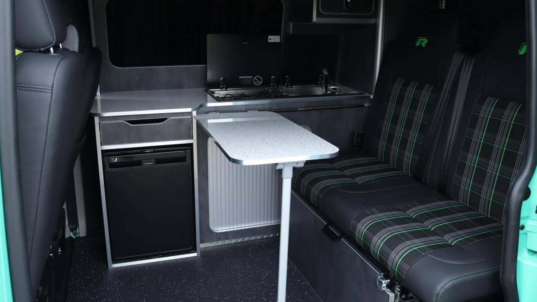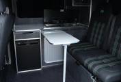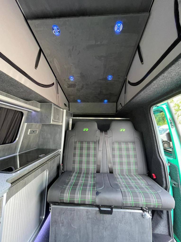 - Interior:CNC Cut Furniture kit made from light weight plywood in Slate grey colour with white sparkle worktop and fold away table edged in brushed aluminium. Kombi side and rear stepsgas ram assisted lift up Bi fold roof bed Fabworx rock and roll bed with VW R upholstery - Front seats to match. Suede Lined roof. Passenger Swivel seats. BaseFold away table. Touch Sensitive Dimmable Cool White LED lighting (Also switches to blue) Switchable colour Led mood Lighting. Dometic Fridge Smev hob sink combi PMS power Management system Split Charge system 110AH Battery.