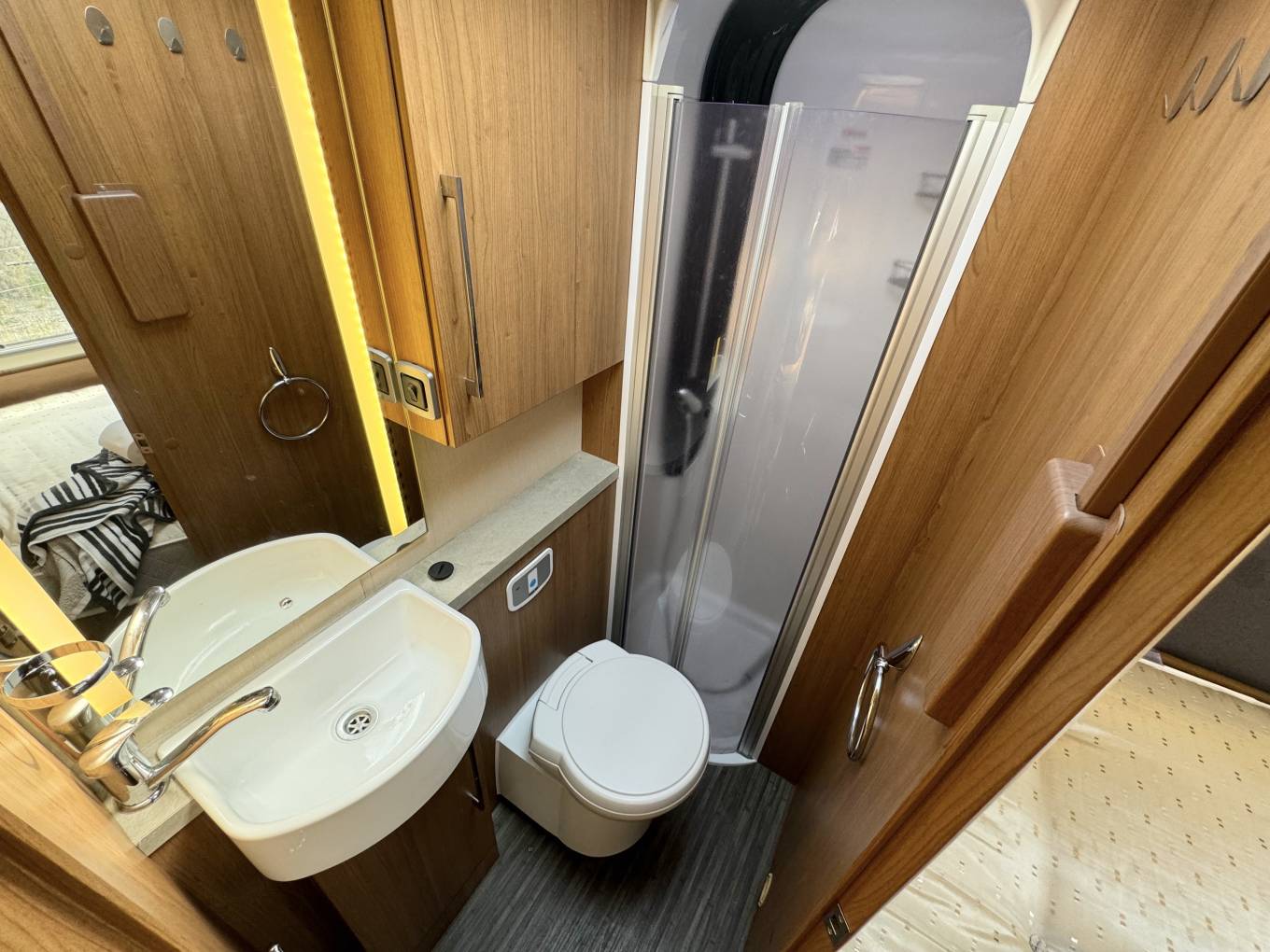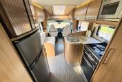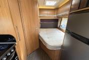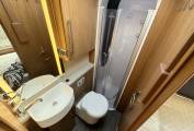 Inside, you’ll find two side-facing benches that convert into a double bed, alongside a fixed French bed at the rear for a restful night’s sleep. Next to the French bed is a well-appointed washroom, complete with a separate shower, hand wash basin with tap, and a convenient toilet cassette.