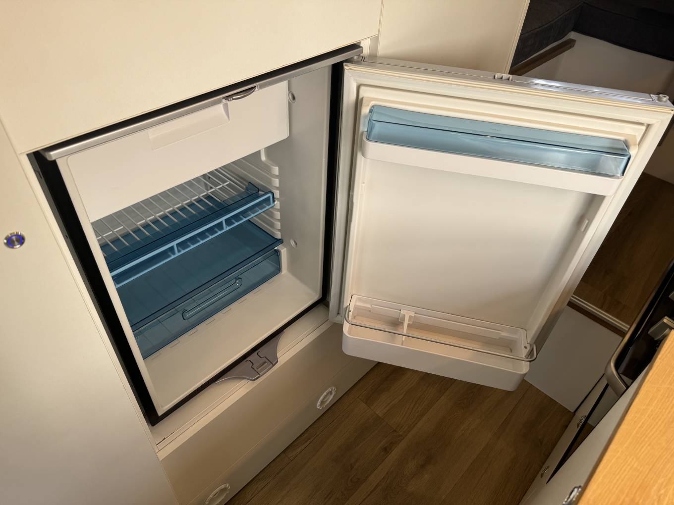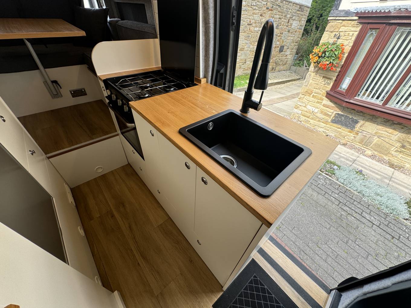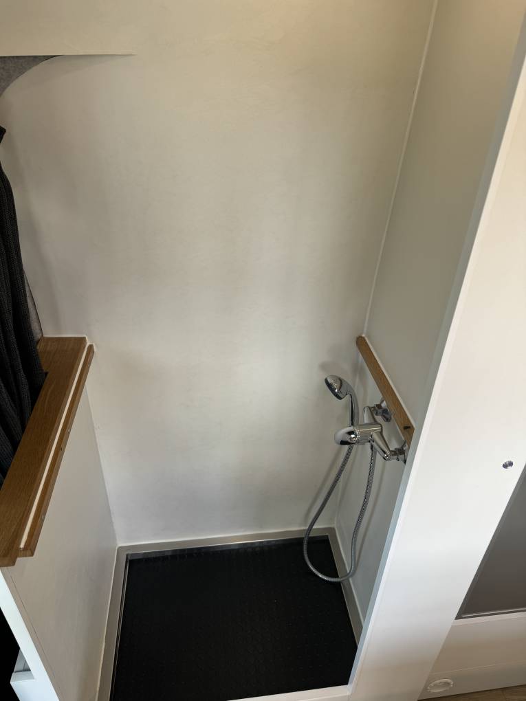 Providing ample kitchen work space for preparing and cooking including a 3 burner cooktop and oven, and large deep sink for washing dishes, Including additional counter top workspace in the convertible shower area and adjacent 80L Fridge Freezer, easily accessible while in the kitchen area.