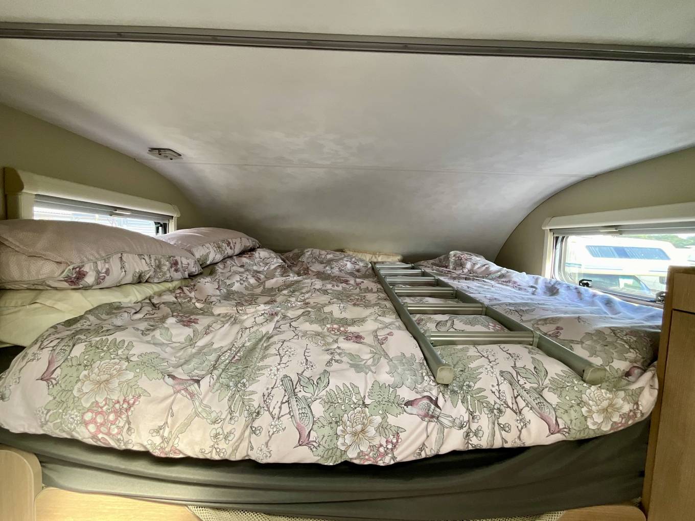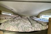 The overcab bed is also a large size, perfect for additional storage or sleeping. Lights and side windows allow for plenty of natural light to enter the area as well.