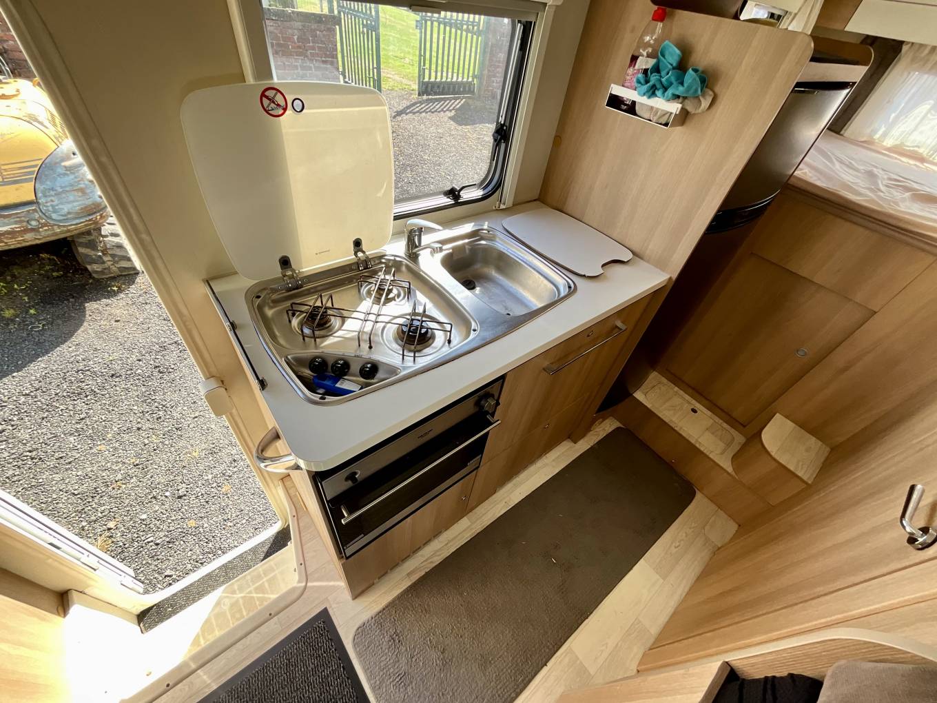 The kitchen is fully equipped with anything the travelling chef needs, including gas hobs, three way fridge with freezer, oven and grill, sink and plenty of room for preparation space. There is a great amount of storage for condiments cutlery and crockery.