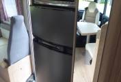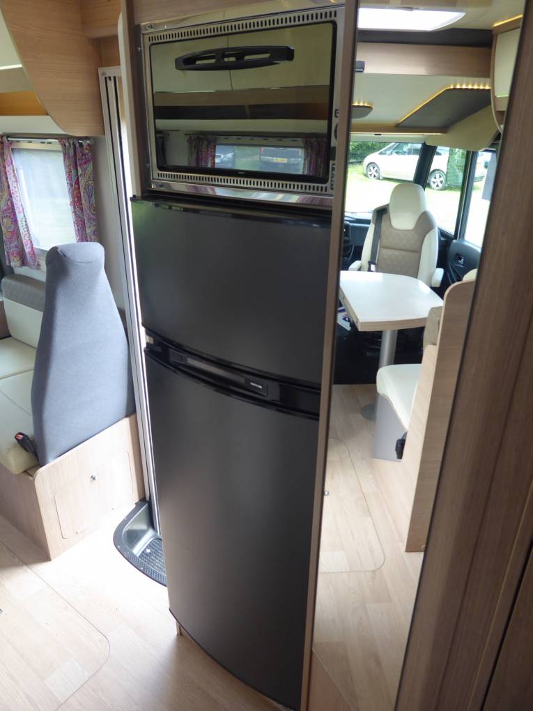 The central kitchen comprises a gas hob with three burners and a sink, and, opposite by the offside habitation door, a fridge, a separate freezer, and a combination oven /grill.