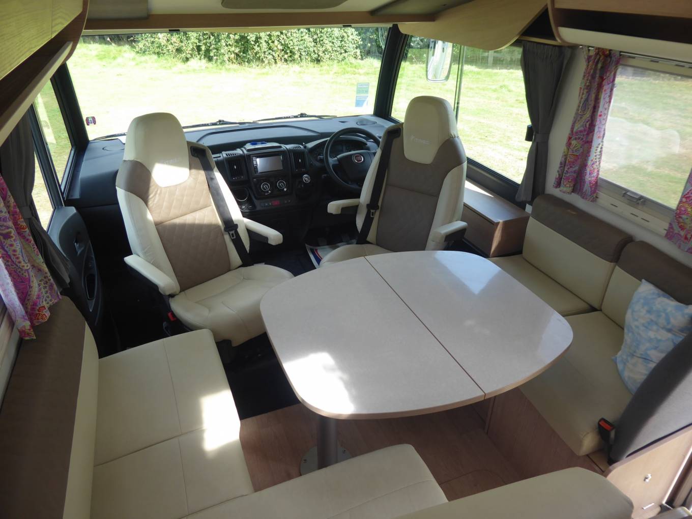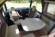 Above the cab is a pull down transverse double bed. When raised the cab seats can be rotated to enhance the forward dining and leisure area, which comprises nearside L-shaped seating (with two additional seat belts and an offside bench (with an additional single seat belt). The seating is configured around a folding top and adjustable table.
