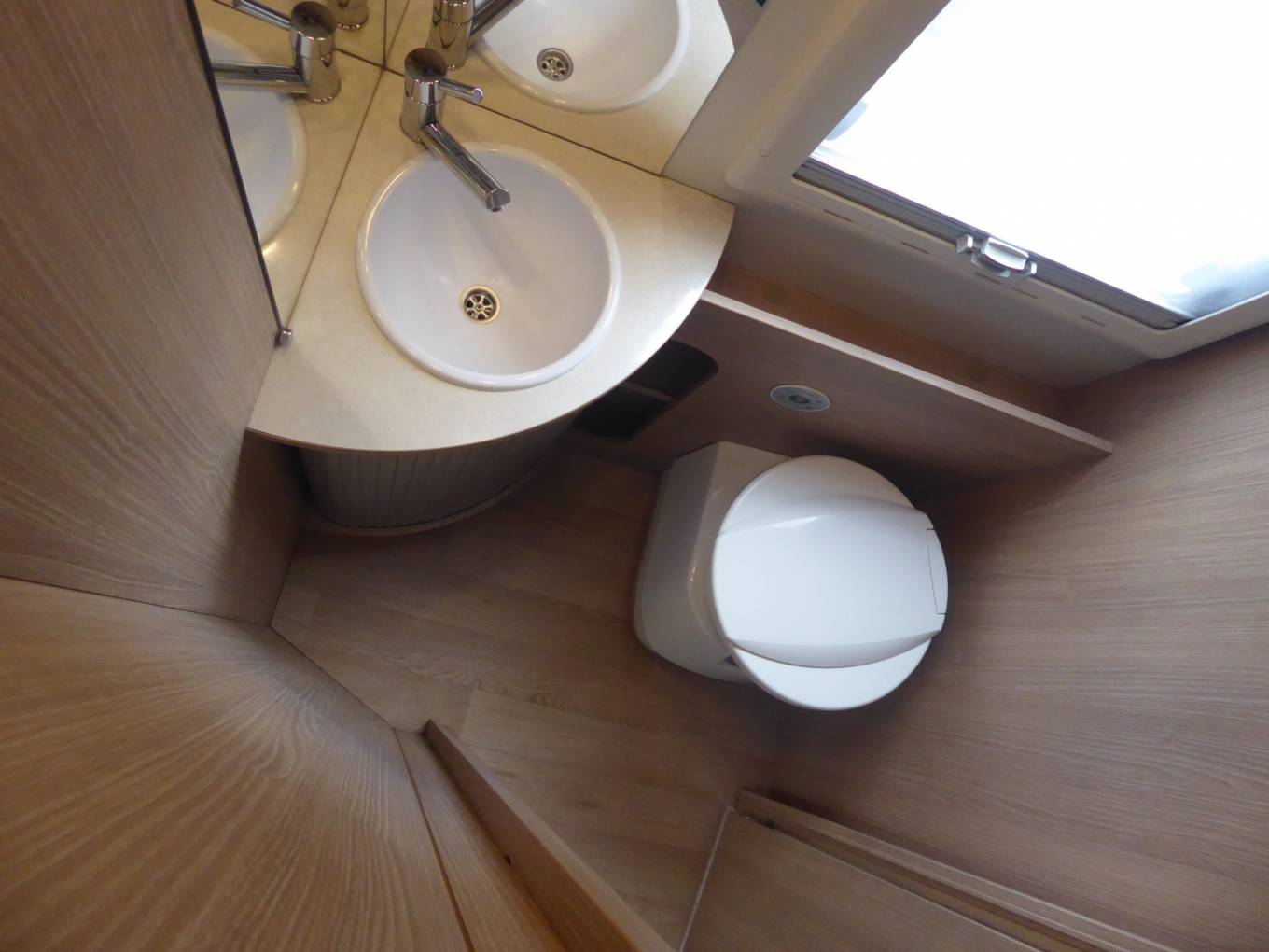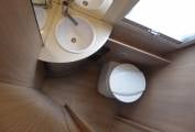 Progressing through the vehicle there is a compartment with a toilet and hand basin, and a separate shower cubicle opposite.