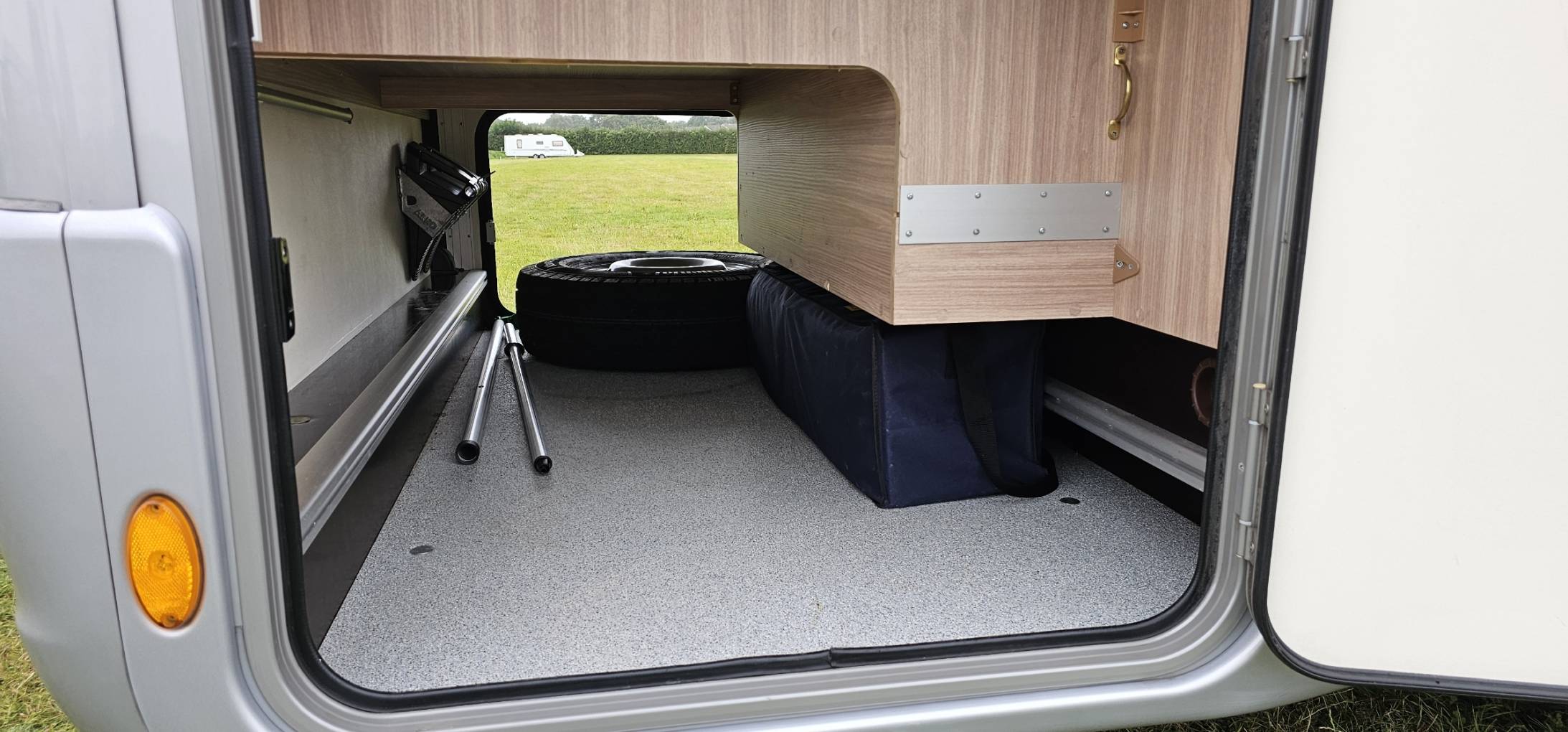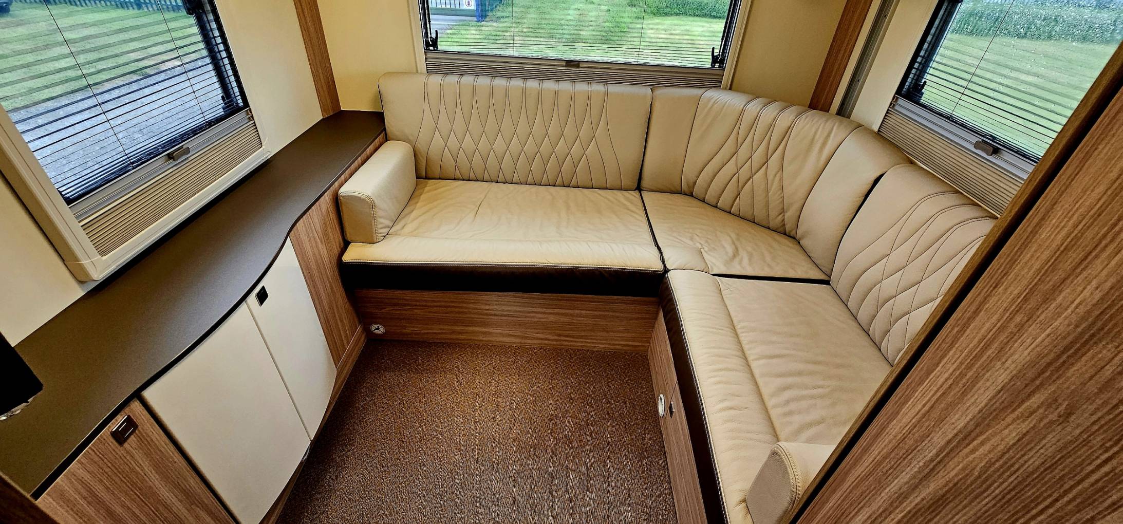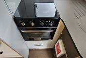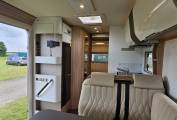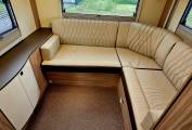 Situated centrally you will find the L-shaped kitchen, which is fully functional, well-proportioned and consists of a stainless steel sink with hot and cold mixer tap, a 3-ring gas hob burner, under counter Dometic oven which shows little signs of use, a tall 3-way fridge with integrated freezer compartment, cupboard mounted coffee machine and plenty of cupboard and drawer space for all your holiday provisions.