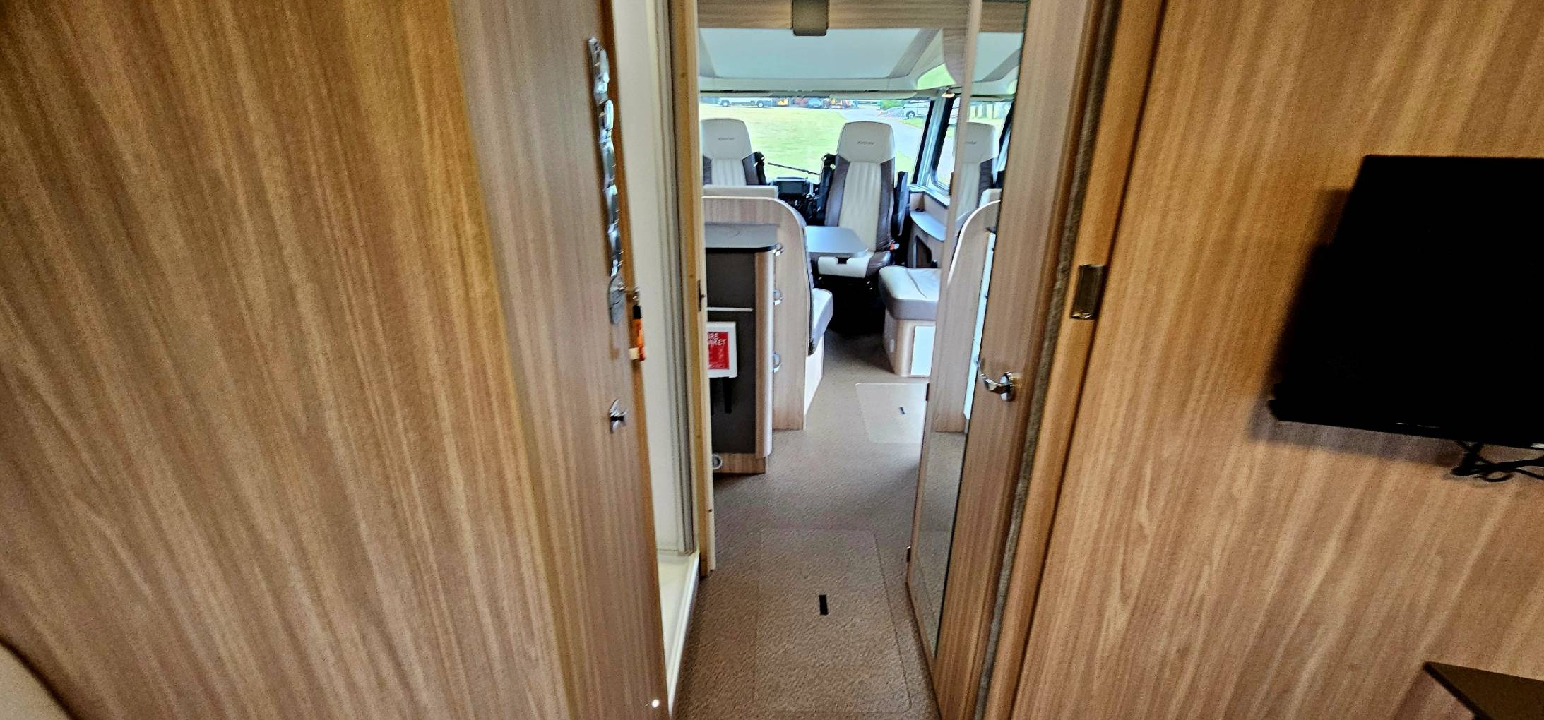 Moving to the rear of the motorhome you will find the bathroom area which can be split fore and aft from the habitation areas with the use of the toilet door and a sliding partition door. This allows privacy for both areas when sleeping and access to the washroom, along with a spacious dressing area.
