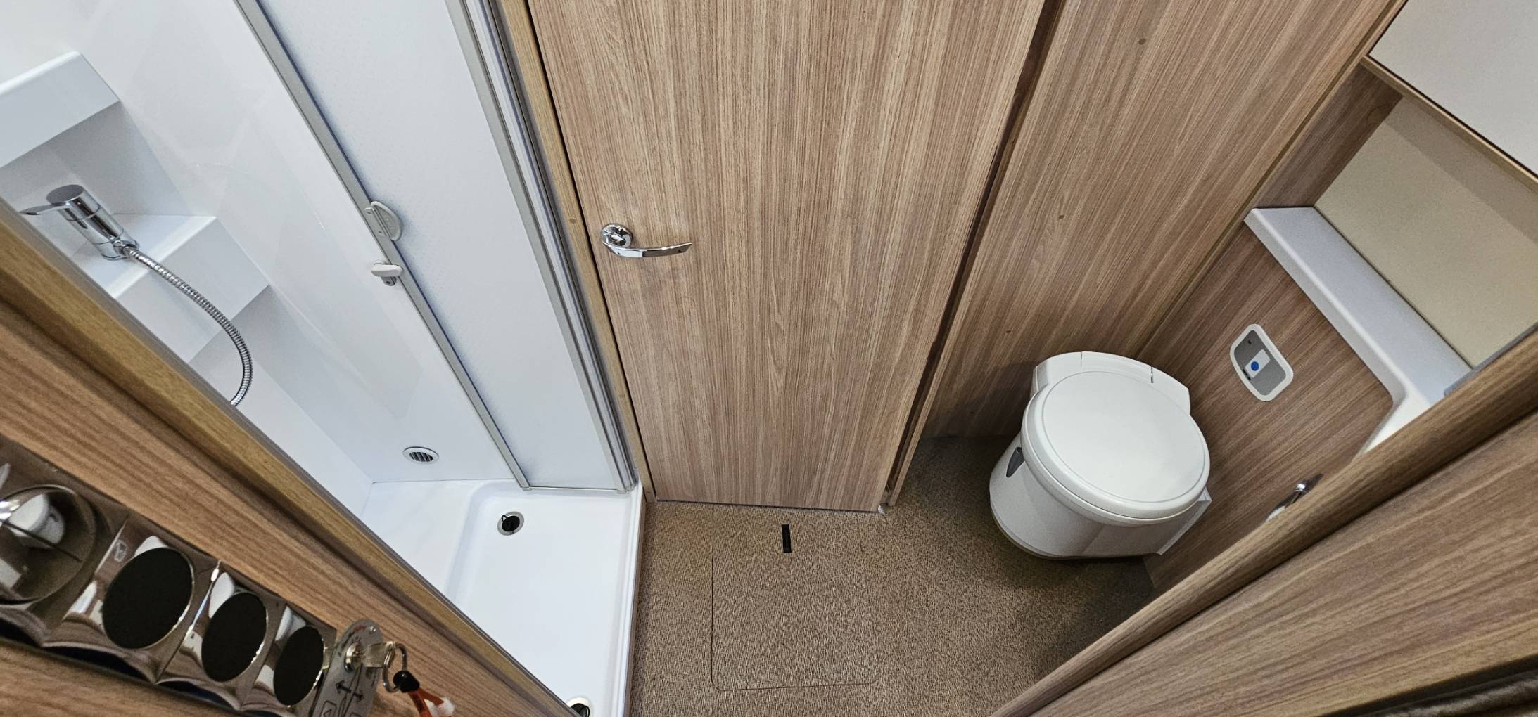 The washroom is situated to one side, providing a Thetford cassette toilet and modern built-in vanity unit with a hand wash basin. Opposite you will find the separate shower cubicle.