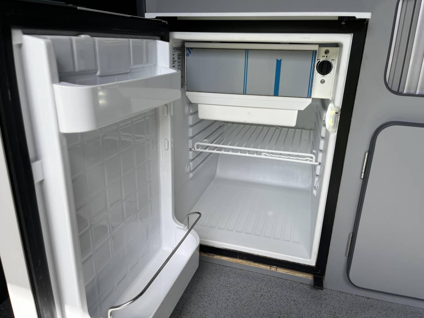 bed, a fully equipped kitchen with a fridge, sink, and stove, and ample storage