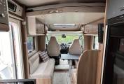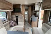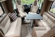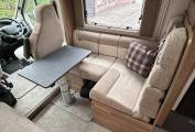 Behind the cab is the spacious lounge dinette which is a lovely spot to relax in. There is a side facing sofa on the nearside and an L shape sofa on the offside. The multi-directional dining table can be manoeuvered into a variety of positions depending on how many people are dining. There are an additional 2 seat belts fitted in the lounge meaning that 4 people can travel safely onboard. At bedtime the lounge area converts into a bed plenty big enough to sleep 2 tall adults. Above the lounge is a manual drop down bed which gives you in effect a fixed bed but one that doesn't eat into your much needed floor space.