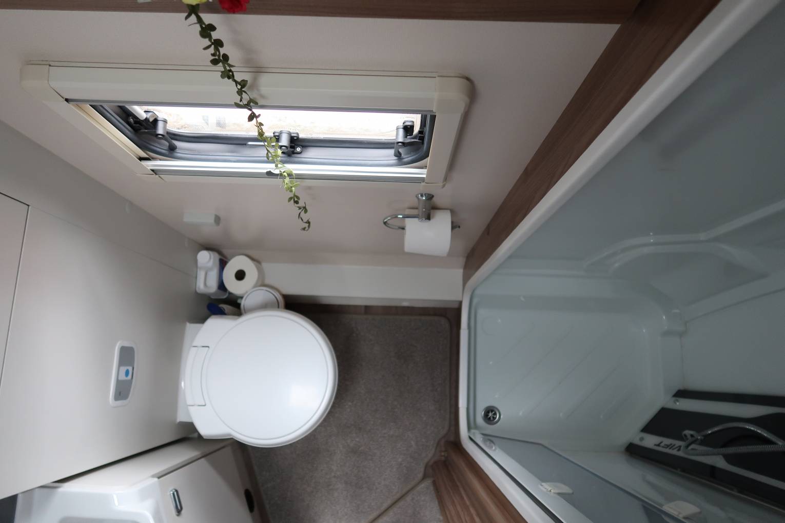 The rear washroom is like a Tardis as it has a really surprising amount of space. There is a totally separate shower with screen doors, a wash basin and mixer tap, a Thetford cassette toilet and a mirrored unit for your toiletries. But perhaps most surprisingly of all is the large cupboard which provides substantial additional storage space.