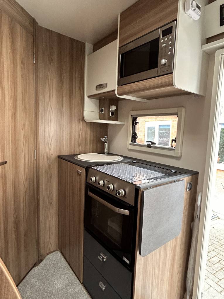 The mid-kitchen is impressively equipped and has all you need to rustle up great food on the go including a microwave, an oven and grill and a 3 gas burner hob. Another standout feature is the large full length Dometic fridge freezer which has automatic selection so it will choose which power source to run on without you having to do anything.