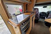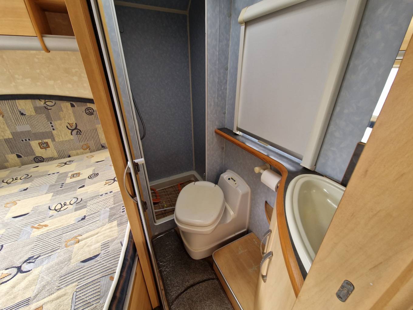 Towards the back of the vehicle, you have the sizeable french bed, beneath which you have additional storage which is accessed using struts. Opposite, the sliding door opens up to a large washroom featuring Thetford toilet with cassette, shower with screen, washbasin, vanity unit and storage.
