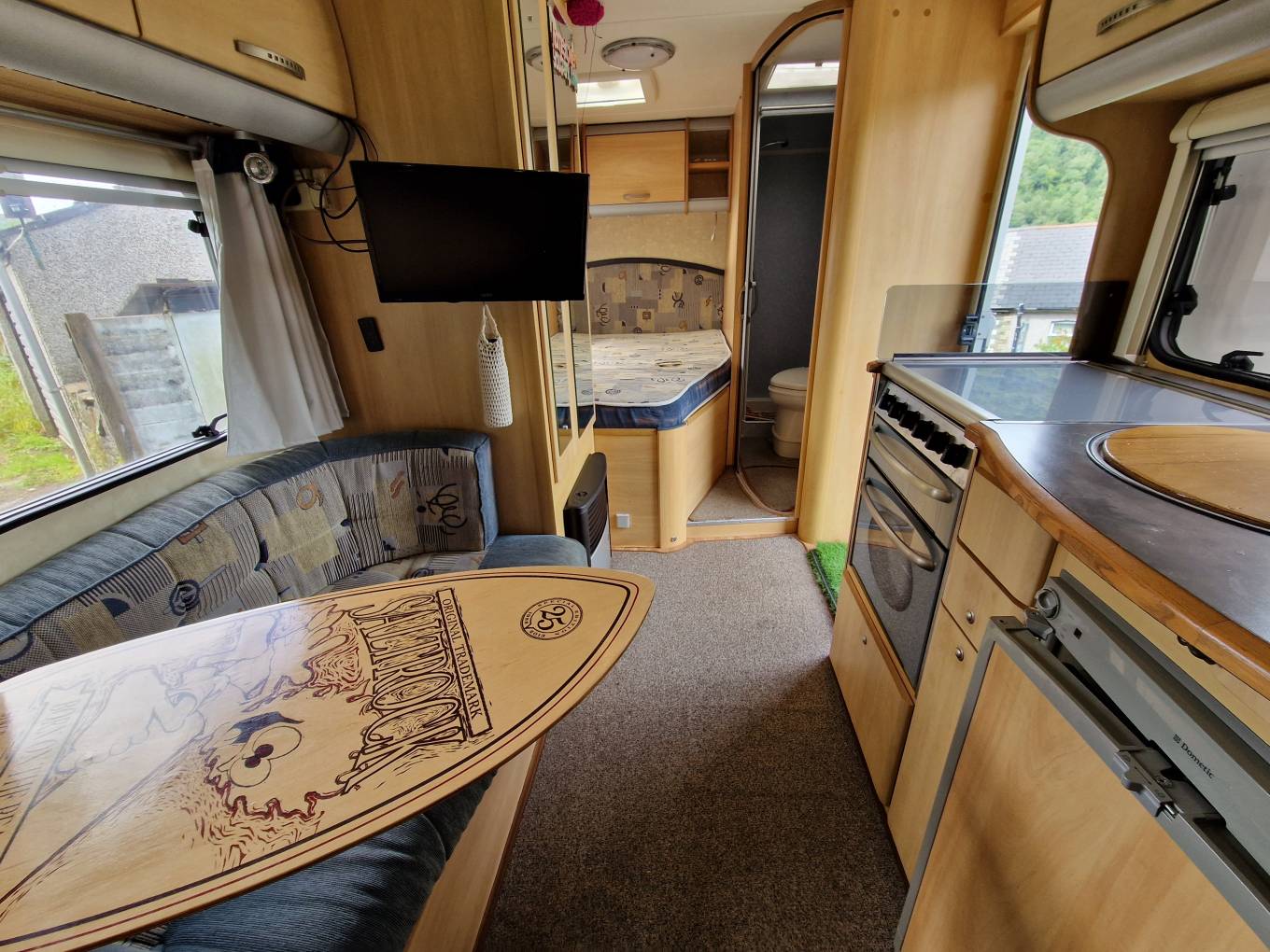 A spacious front lounge comes with both a small adjustable table that sits on a leg between the drivers and bench seat and both the drivers and passenger seats swivel creating a really good social area. Beneath the bench seat sits the Truma 10 litre boiler which works with a Truma blown air heating unit.We also have a TV in this area.