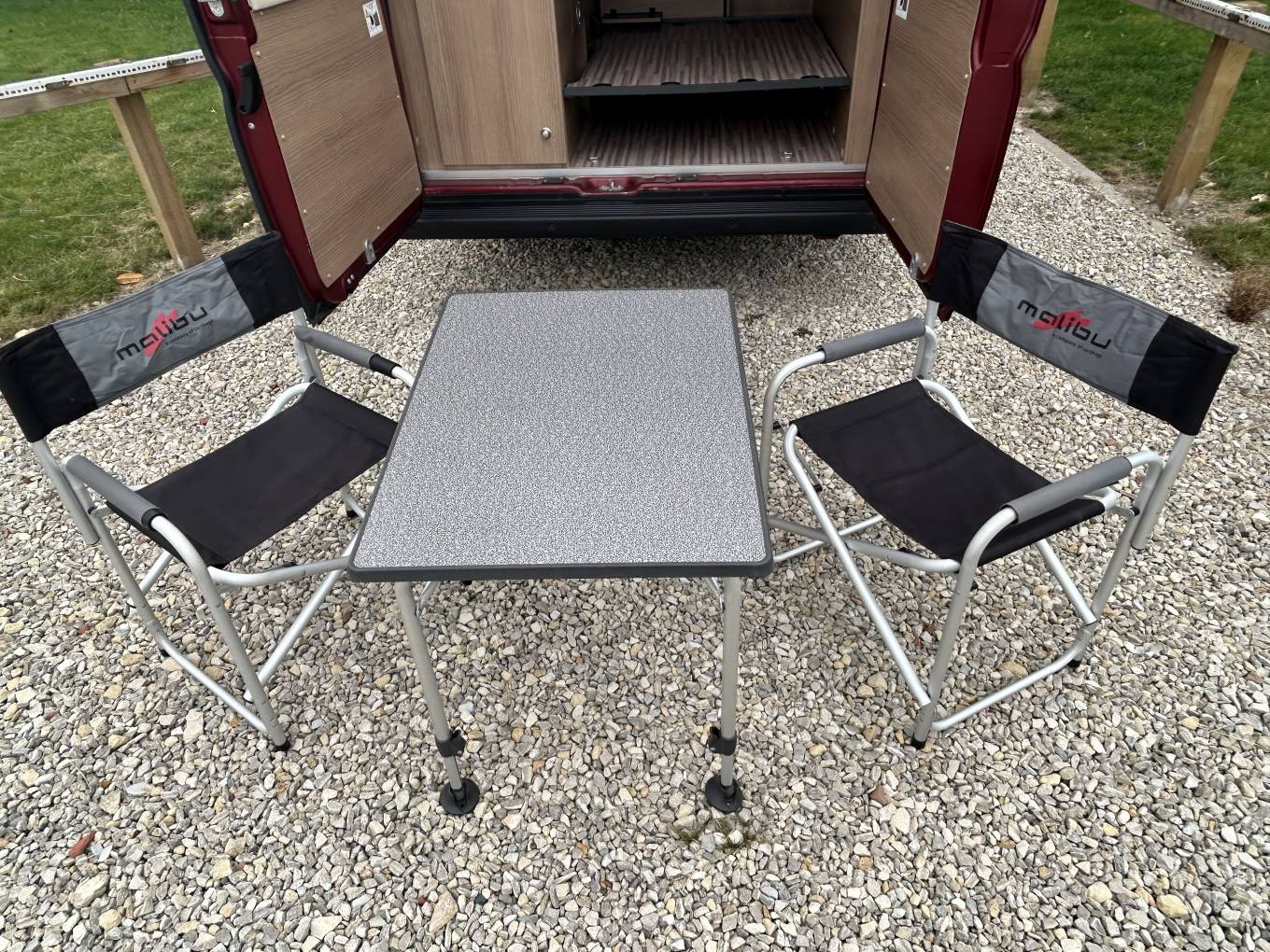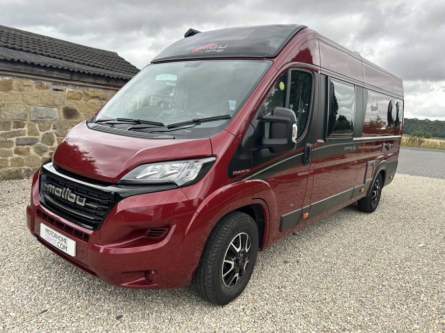 This motorhome is designed for extended adventures, featuring two leisure batteries, a solar panel, and a wind-out canopy. Security and peace of mind are enhanced with the Phantom Tracker. To complete your travel experience, the Malibu comes with, a chair and table set, the extra sleep pack, and carpets. Alloy wheels, Just the style and quality of this motorhome inside and out makes it special