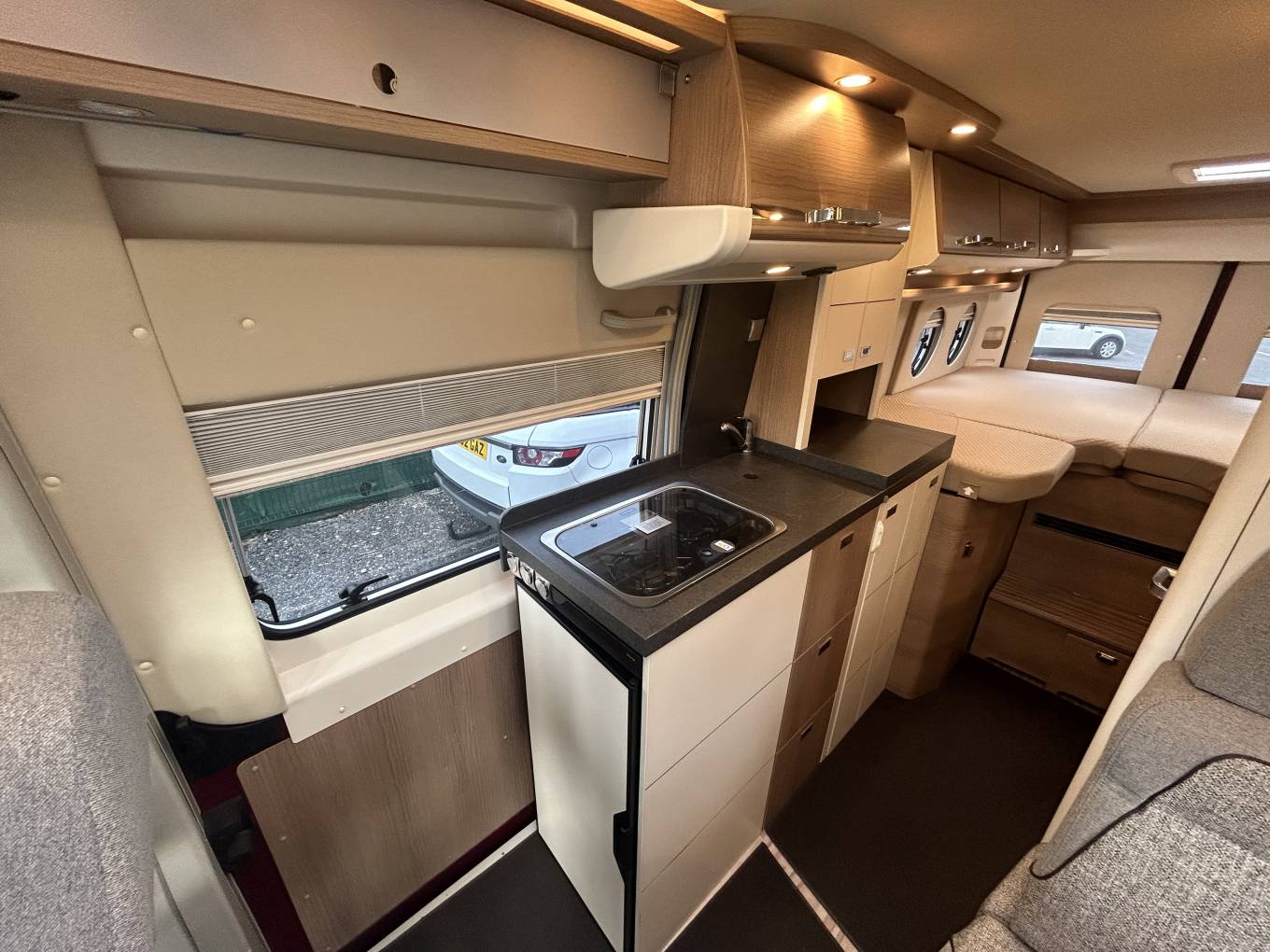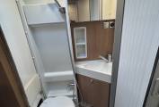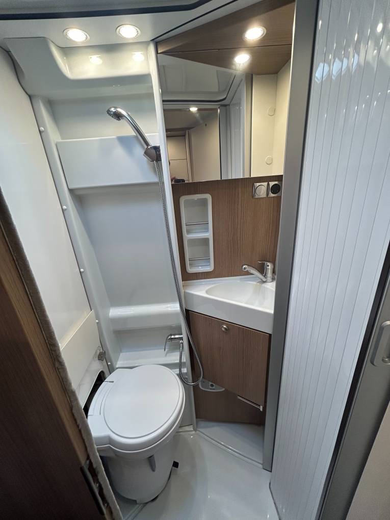 The well-equipped kitchen boasts a fridge freezer, a sink with a mixer tap, a gas hob, ample storage, and generous worktop space, making meal preparation a breeze. The washroom door offers privacy by separating the bedroom from the lounge area. The washroom cleverly converts by tucking away the cassette toilet to zone off a shower room which includes a sink, mixer tap, storage and shower. The rear comprises fixed single beds , lift the bed and there is more storage than you could wish for, this area can also be accessed from the rear doors and you could even fit two bikes in, a large wardrobe for your clothes, This motorhome is heated by a Truma combi boiler and is inet ready.