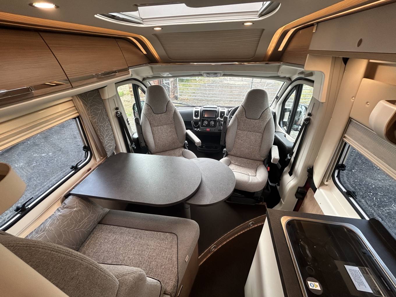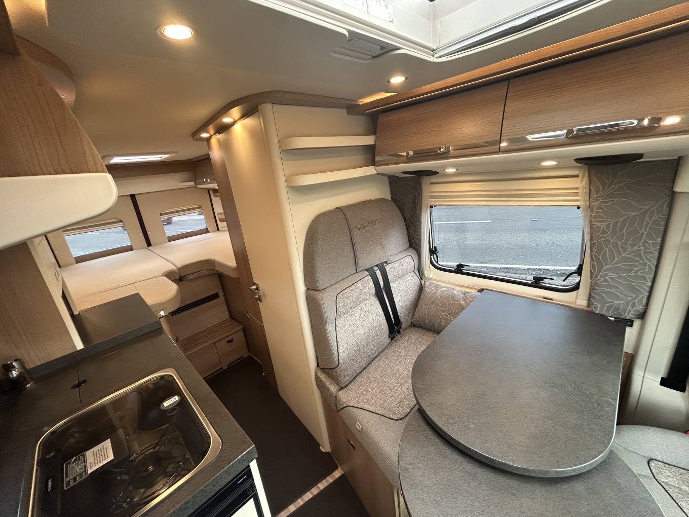 Experience the ultimate in luxury and freedom with the Carthago Malibu 640 LE RB GT Skyview Motorhome. The LE RB signifies the ‘First Class – Two Rooms’ layout – a novel design of washroom and end bedroom. Built on a robust Fiat 2.3 140bhp Automatic, this motorhome offers a driving experience like no other. Enjoy the convenience of cruise control, air conditioning, a reverse camera and proximity beepers , satellite navigation, Bluetooth hands-free, DAB Radio, mood lighting and built-in blinds. The cab features electric windows and wing mirrors, along with two comfortable captain seats that swivel to transform the space into a cosy dining area. The dining room includes two forward-facing seats with seat belts and a removable table, providing plenty of storage options with the surrounding wall/floor units and under-floor space.