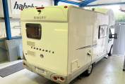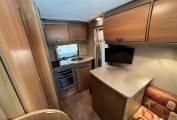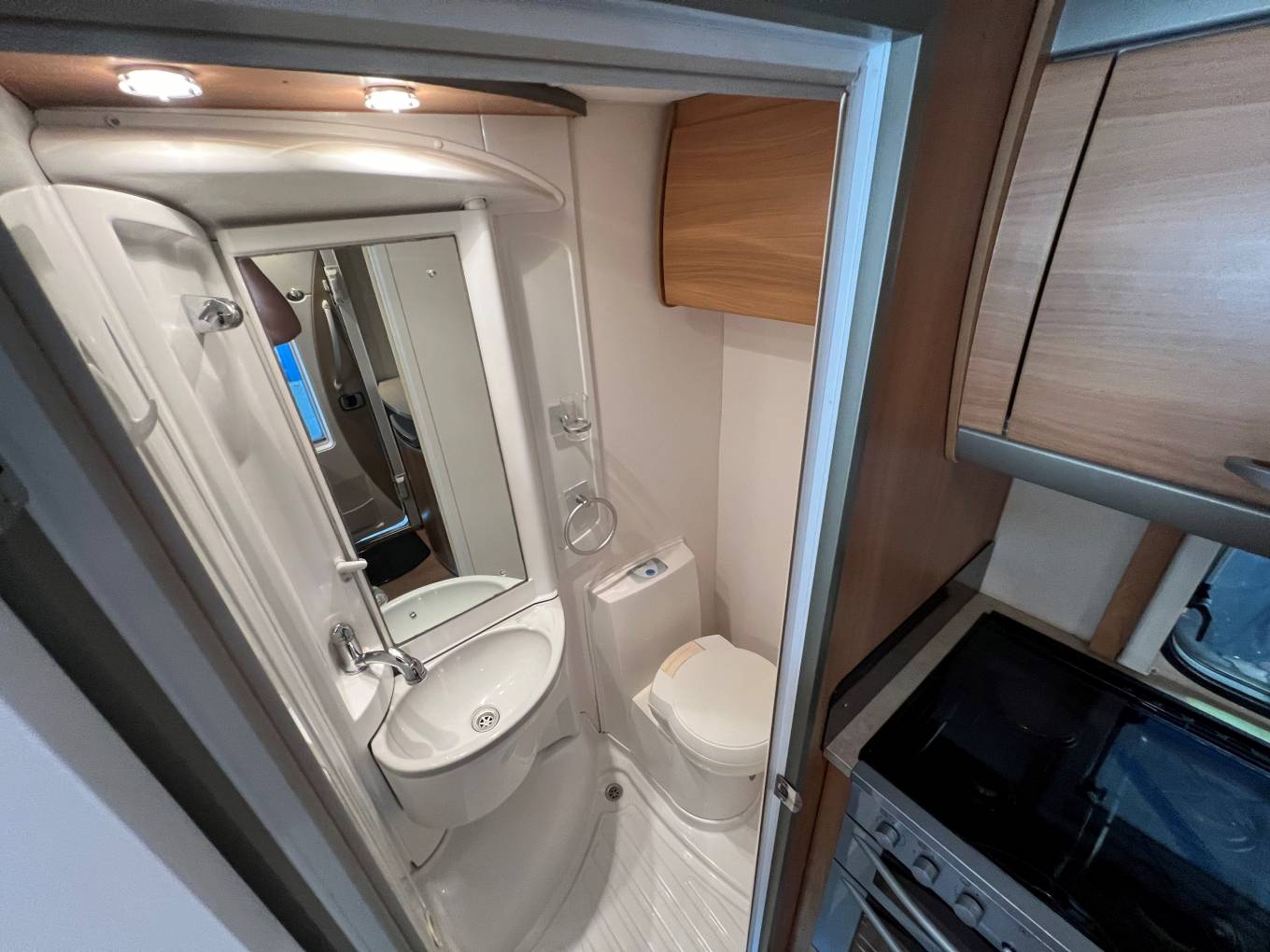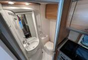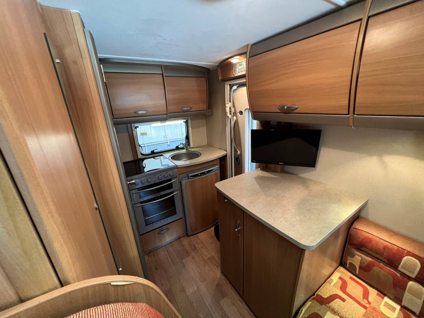 The main entrance door is at the rear which leads you into the end kitchen. Here you have a gas oven and grill, a 4 gas burner hob, a three-way fridge with an icebox, a stainless steel sink with mixer tap and storage space in the pull out drawers and overhead lockers. A rear window throws in plenty of daylight. The washroom which is situated on the offside towards the rear consists of a cassette toilet, a shower, a wash basin, a large mirror and a bathroom unit to store your toiletries. A large skylight ensures that you have plenty of natural light when getting yourself ready.
