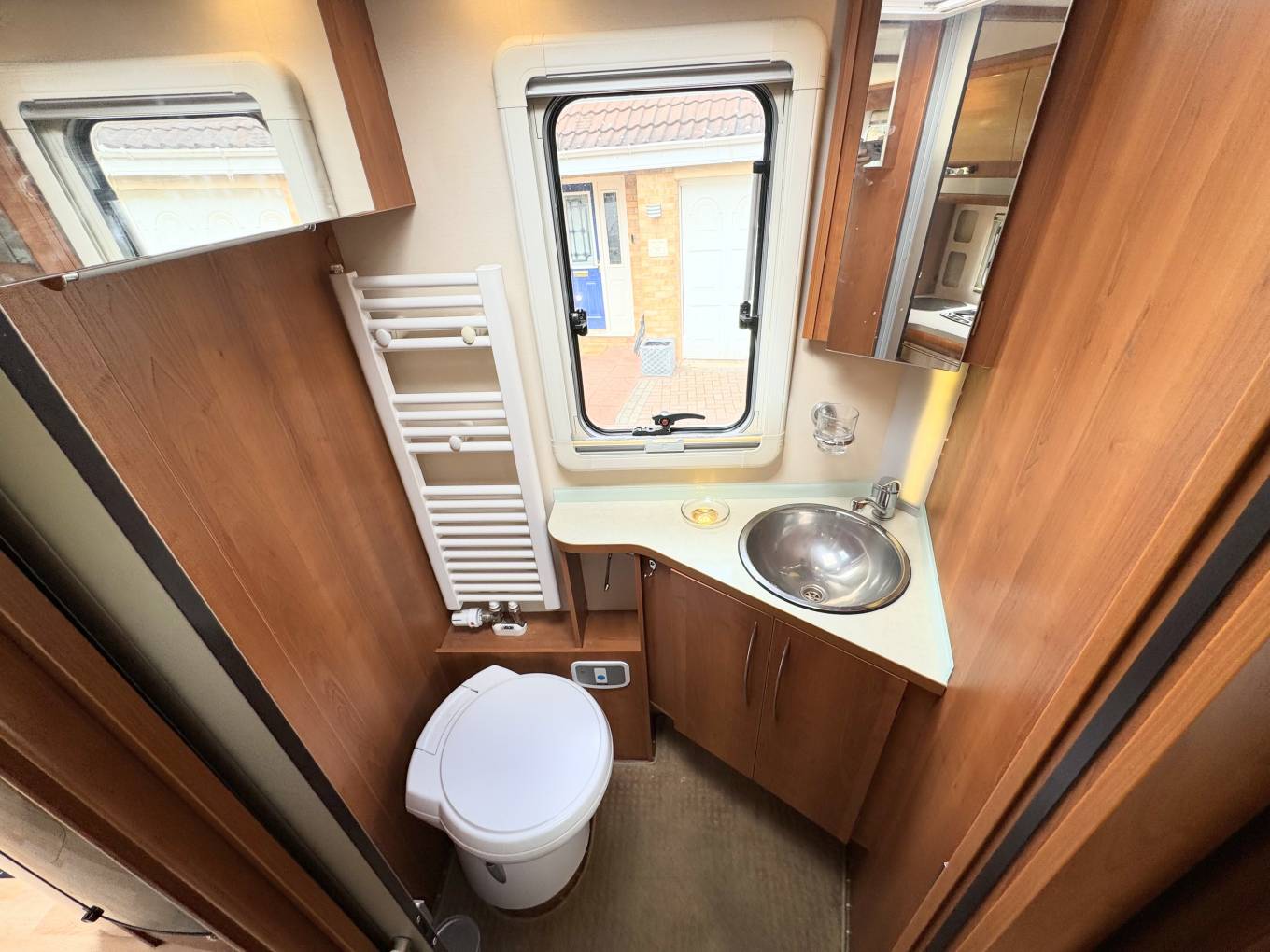 The en suite bathroom includes a toilet room with a SOG toilet cassette, a vanity sink with a mirrored cabinet, and a large separate shower for your convenience.