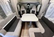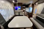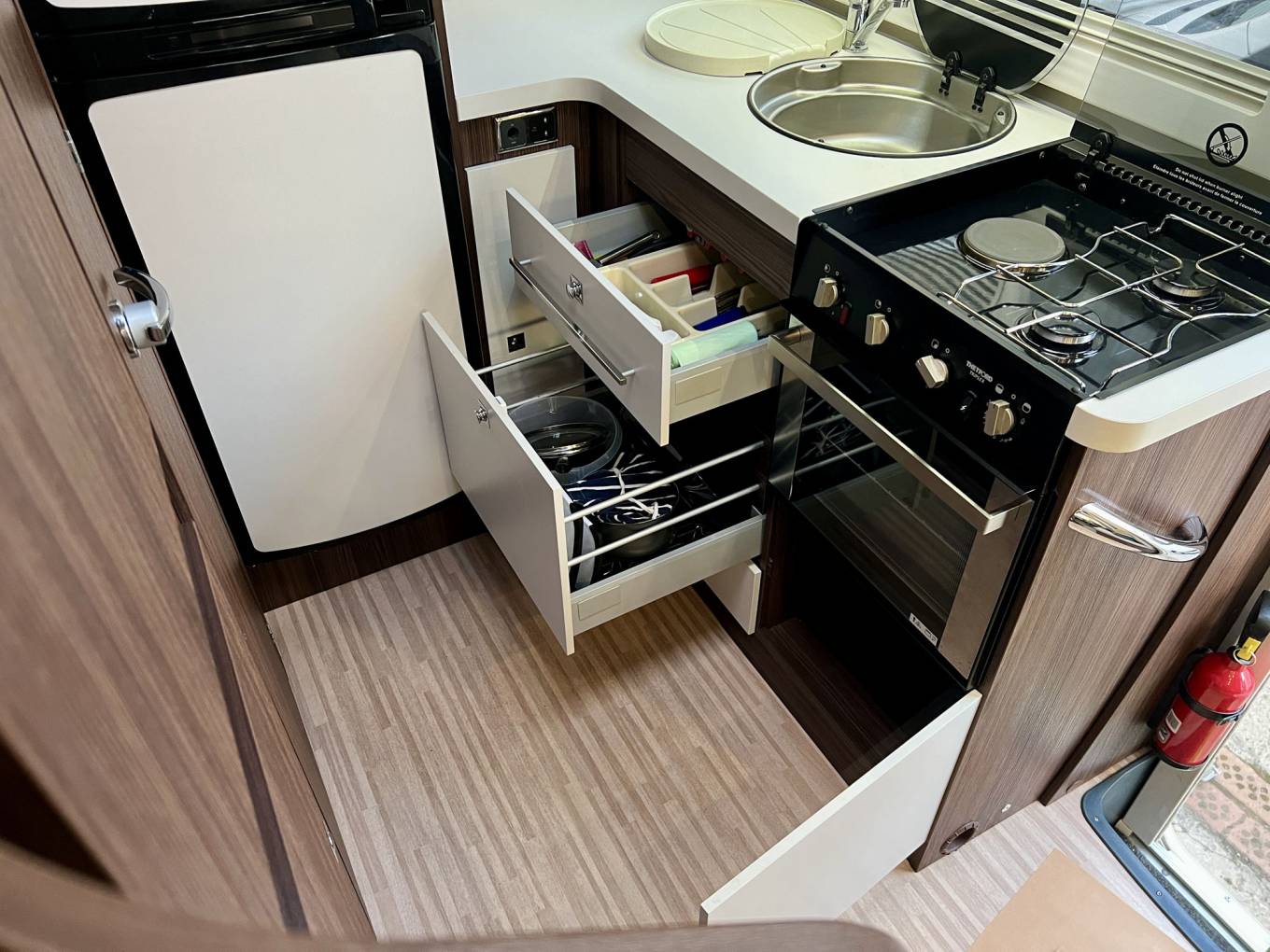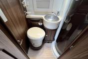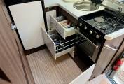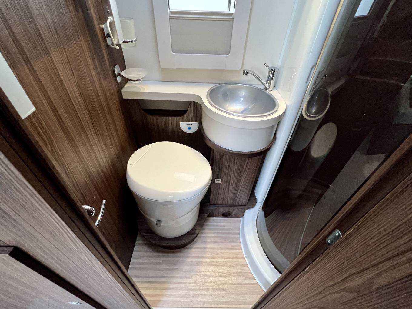 Inside, you will find no space wasted, with both cab seats swivelling into the dinette area around a multi position pedastal table, which also lowers electrically to form part of the lower bed base. Above the dinette is the electrically lowering double bed, with protective nets and access ladder. There is a comprehensively equipped L kitchen with dual fuel hob, gas oven and grill, fridge freezer and microwave. Throughout the motorhome, there is a high standard of fixtures and fittings, with a modern styling and ambience.