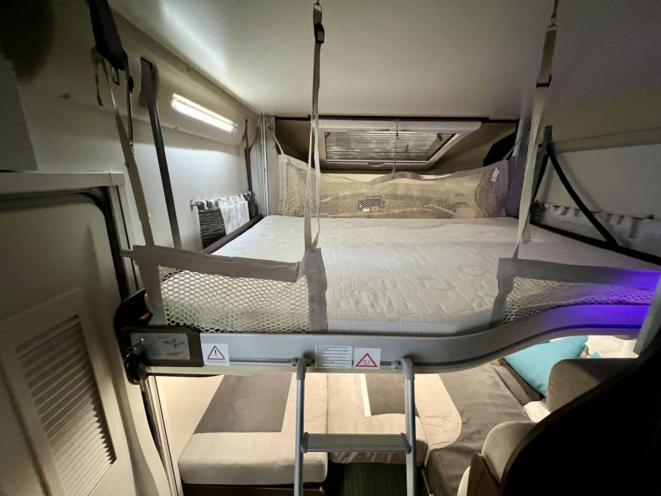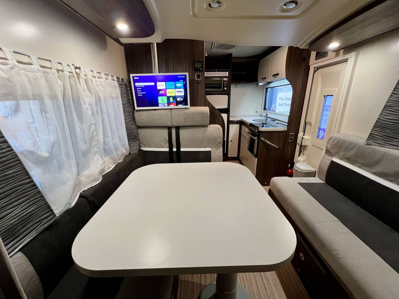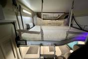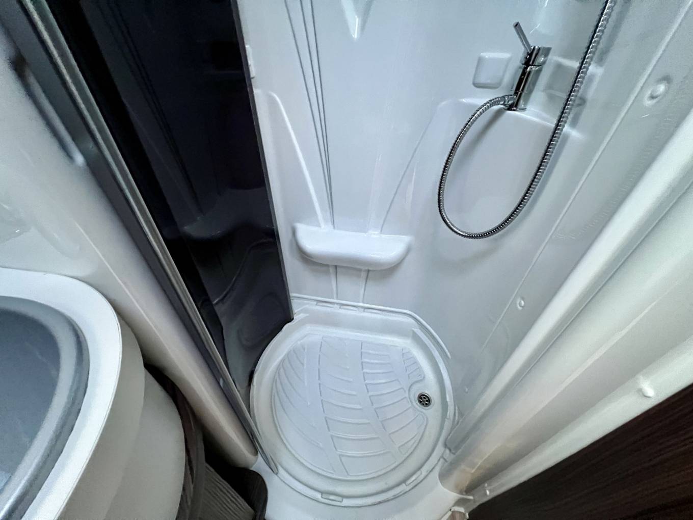 Up front the cab controls are light and include enhancements such as integrated blinds, cab air conditioning, cruise control, multimedia unit satnav and reversing camera. 150bhp Fiat Ducato base with 6 speed gearbox. Outside fitted equipment includes roll out sun canopy, solar panel, 2 bike rack, external shower, external bbq point, access to gas bottles and filling point.