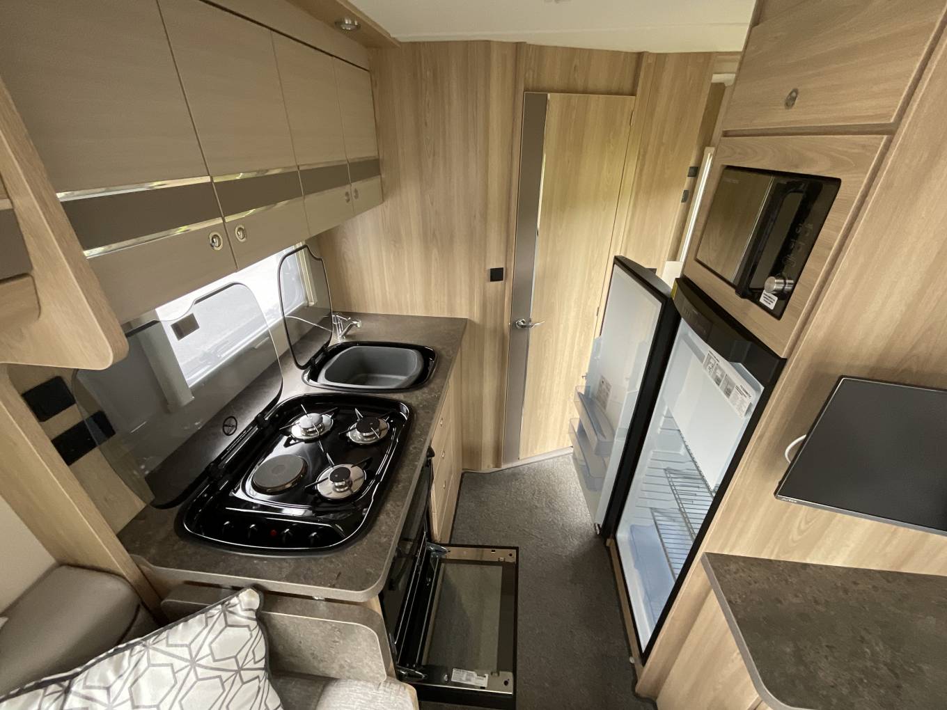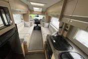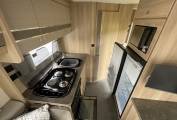 The van has an excellent spacious living area at the front and features two long side facing bench sofas and the two captains chairs. There is also a cleverly stored folding table that can be used to create a wonderful place to enjoy a meal or snack - or taken outside if you prefer. Moving back the motorhome has an extremely well equipped kitchen featuring an oven, grill, hob with 3 gas burners and 1 electric hot plate, microwave oven, sink with mixer tap and 3-way fridge with removable freezer compartment.