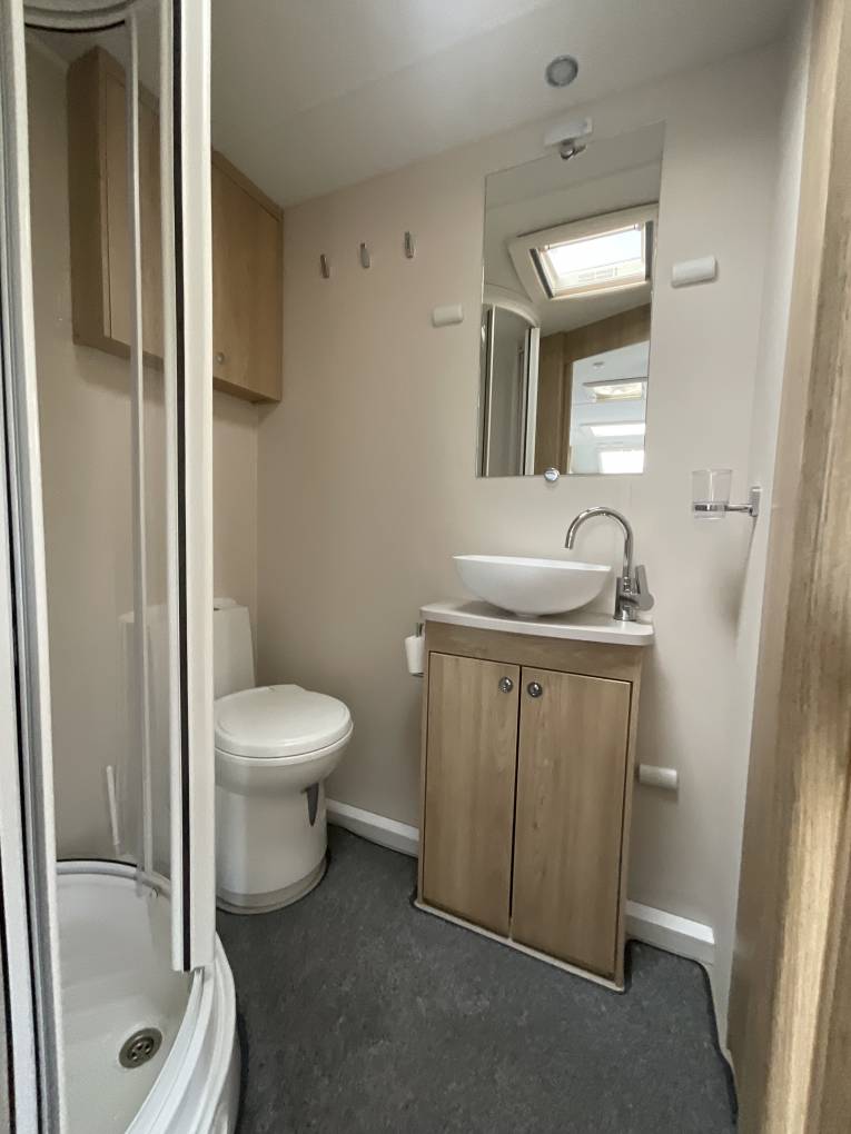 The 175 is a very comfortable van to sleep in with the side sofas making up an extremely large double bed or can equally be used as two comfortable singles if you prefer. The real star of this motorhome is the large washroom at the rear which features a Thetford flush cassette toilet, vanity sink and large separate shower. There is also lots of space in the washroom which is definitely not always the case, with a large wardrobe and a chest of draws inside. Heating and Hotwater is provided by the Whale heating system on gas and mains hookup. This particular motorhome has a number of extras including a Dometic wind out awning, rear bike rack for 2 bikes, reversing camera and the optional extra front skylight, there is also a small mobile solar panel to keep the vehicle battery topped up when not in use.