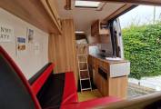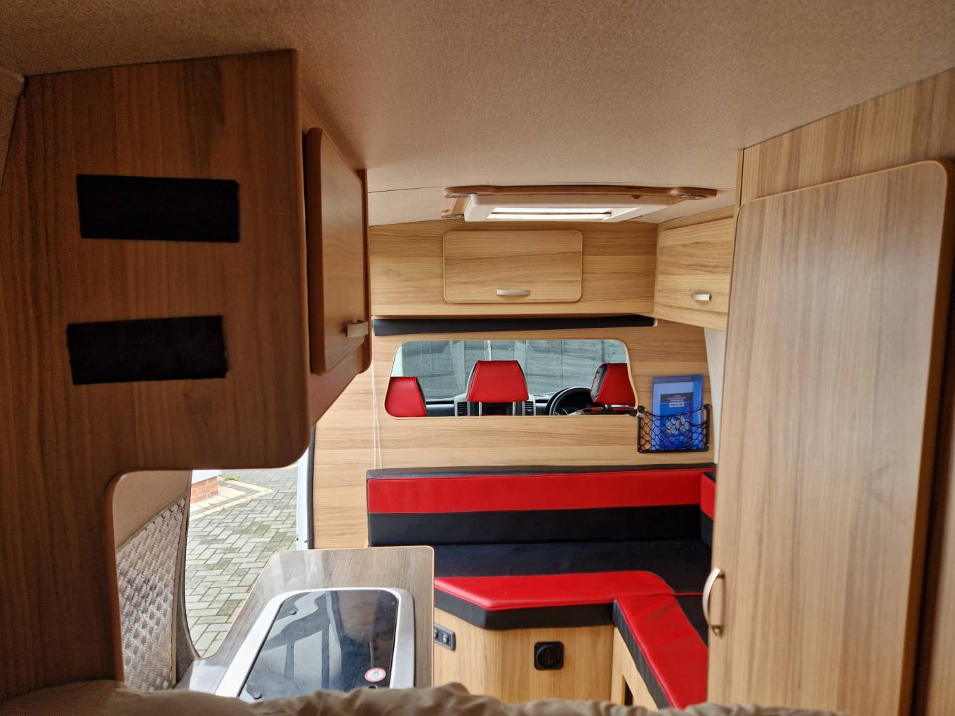 The front L-shaped lounge can comfortably sit four, and is illuminated by ambient lighting, coupled with a Heki skylight at both the front and rear of the van. At night, the lounge can be quickly converted into another single, forming a three berth motorhome.