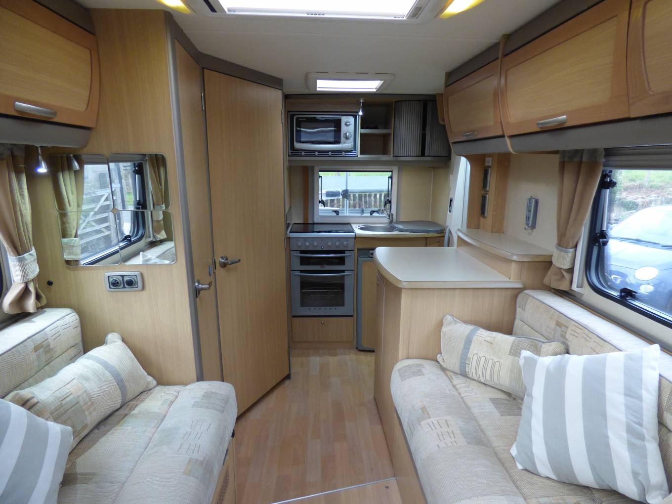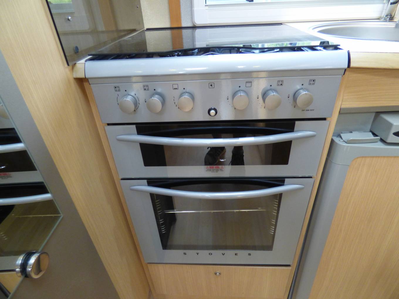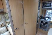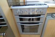 The washroom has a Thetford cassette w.c., large shower tray with full height shower and mixer taps, screens and a washbasin with cupboard underneath and mirror above. The kitchen area has plenty of storage and has a 4 ring hob (one electric), separate grill and oven, microwave and sink and a Thetford fridge with freezer box.