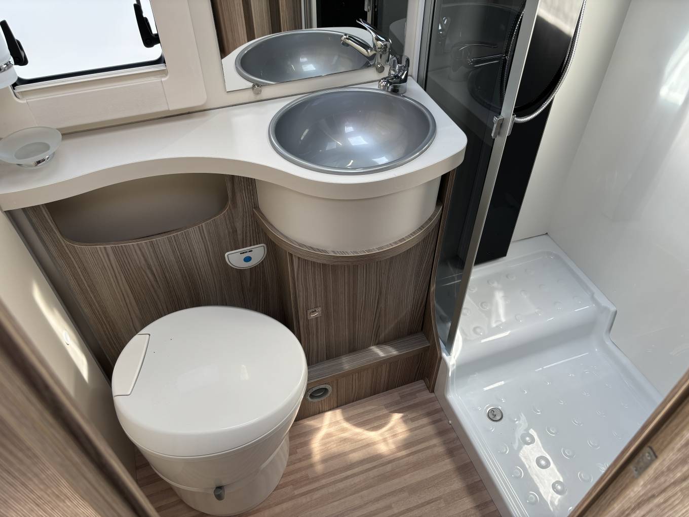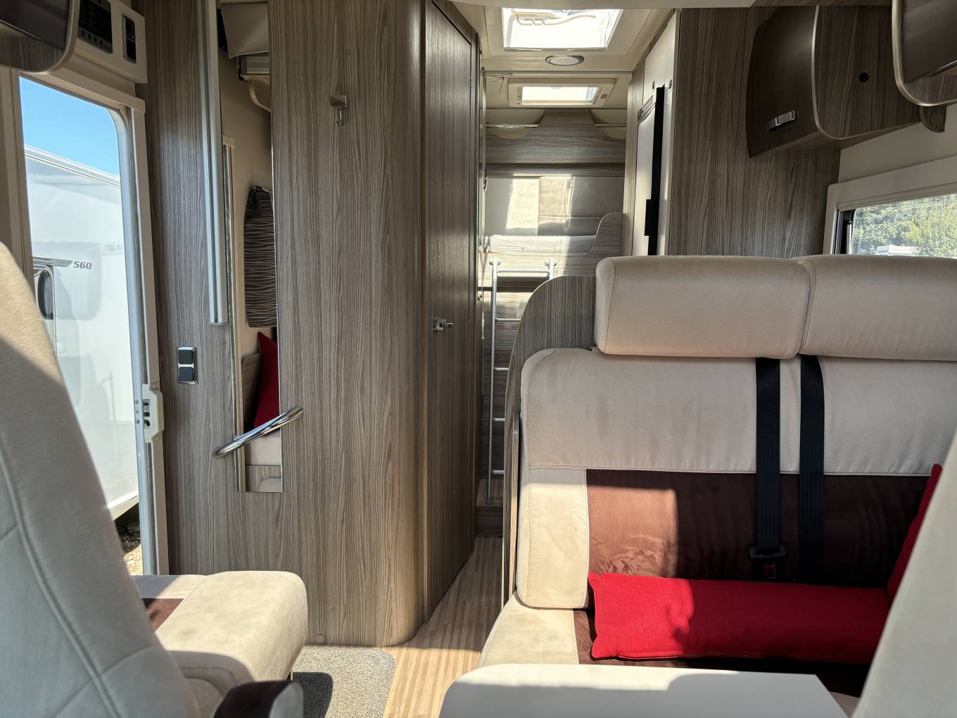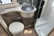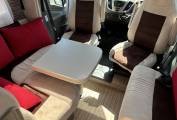 There is a great dinette area towards the front which has a really useful adjustable table and is complemented by the 2 swivel seats in the cab. This converts into a double bed and above this is also a pull down double bed so there are plenty of sleeping options.